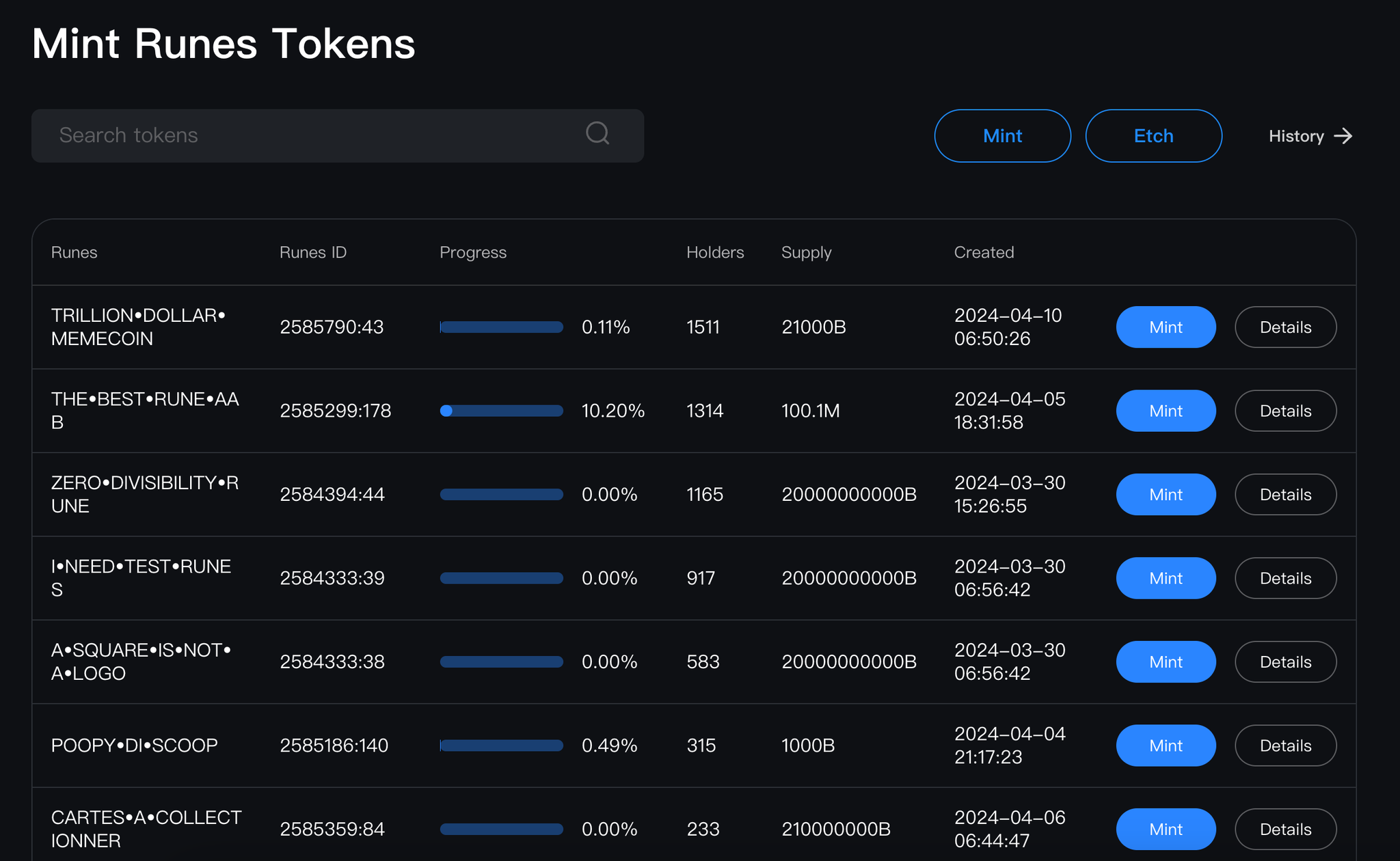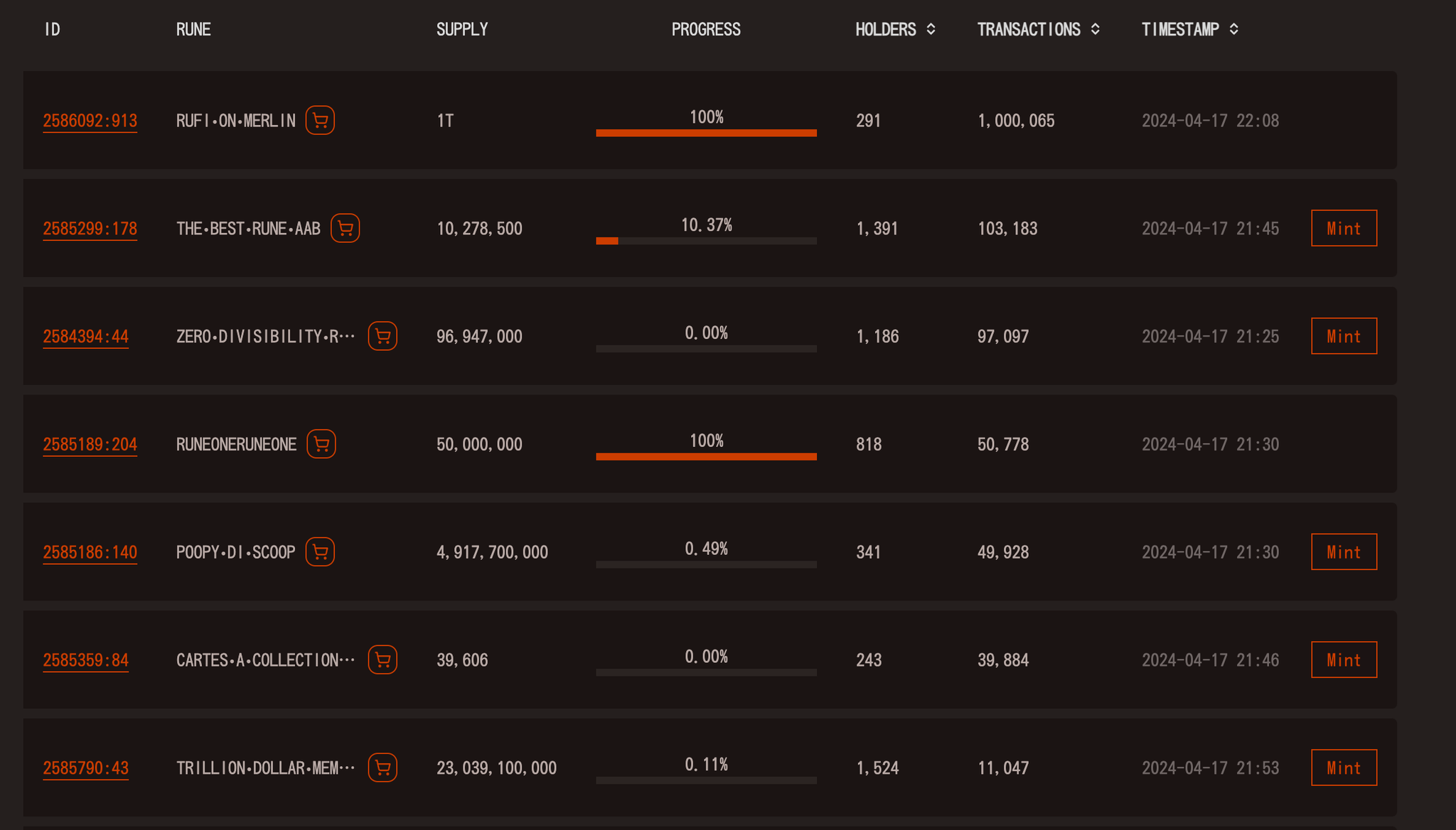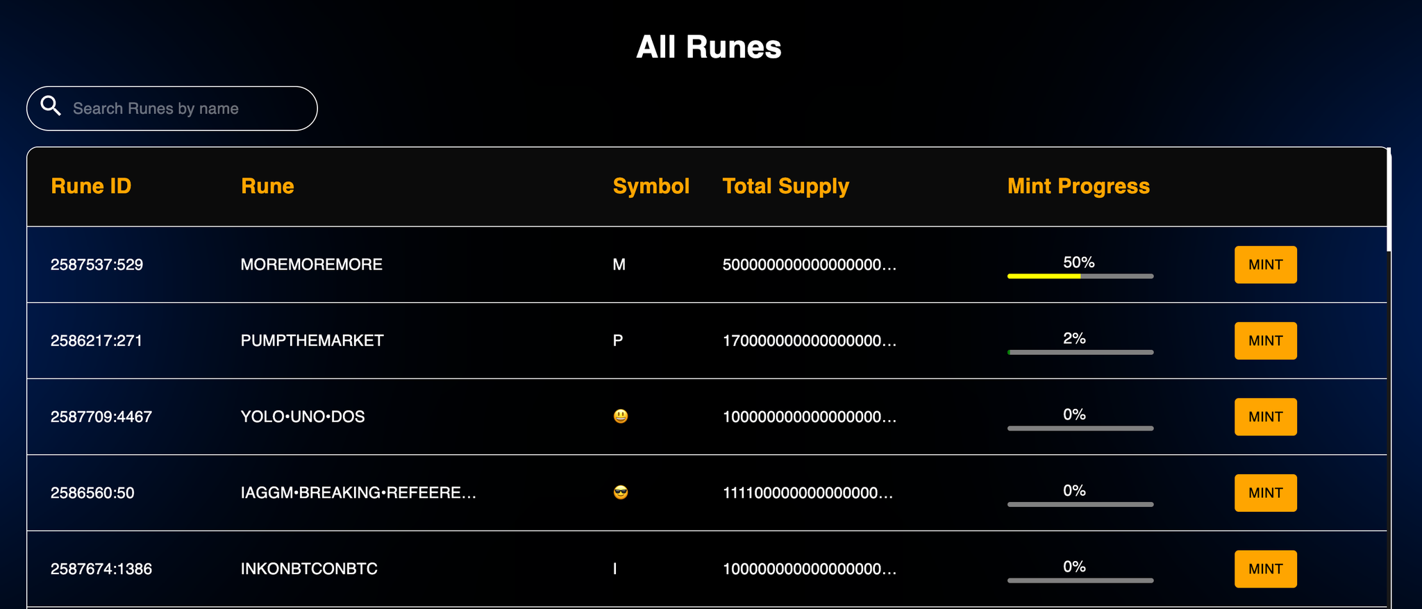 我们可以在 Explorer 界面找到已经部署好的符文,可以看到每一个代币的进程,选择正在进程未到 100%的代币。