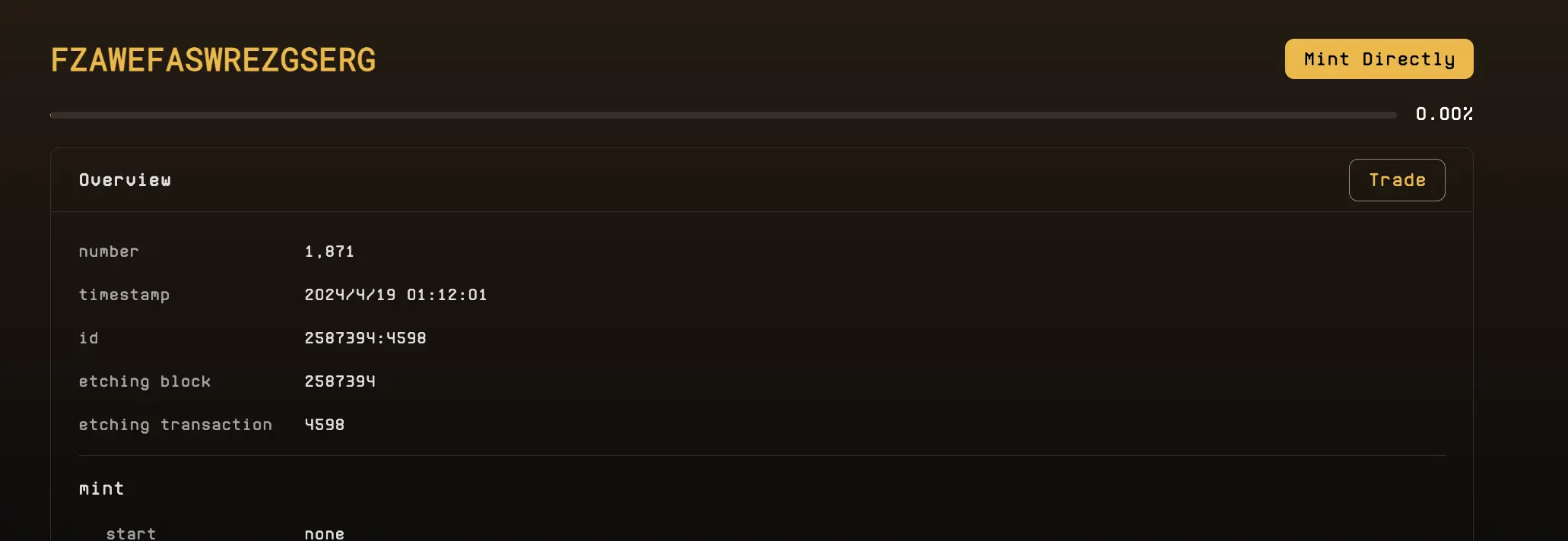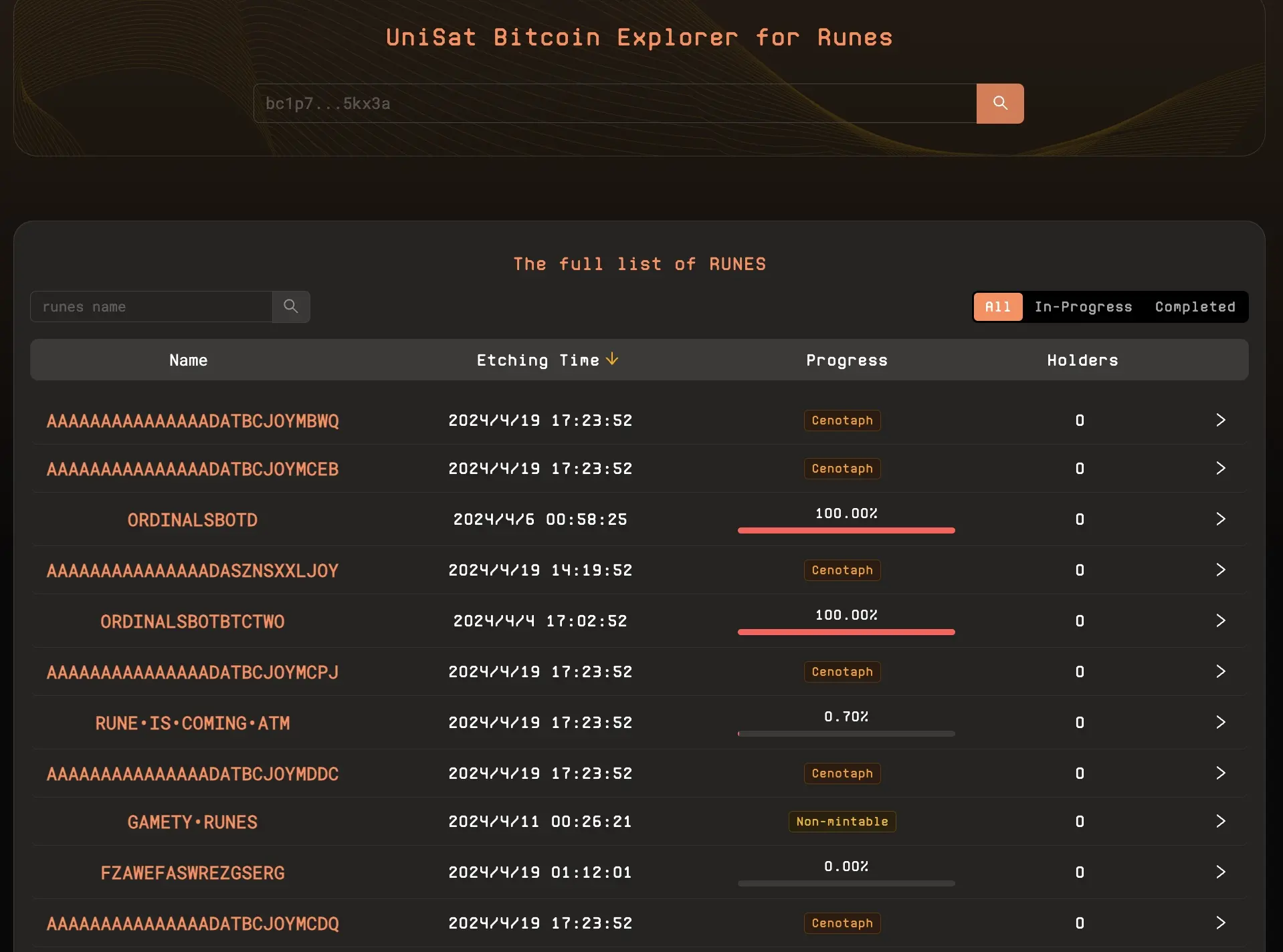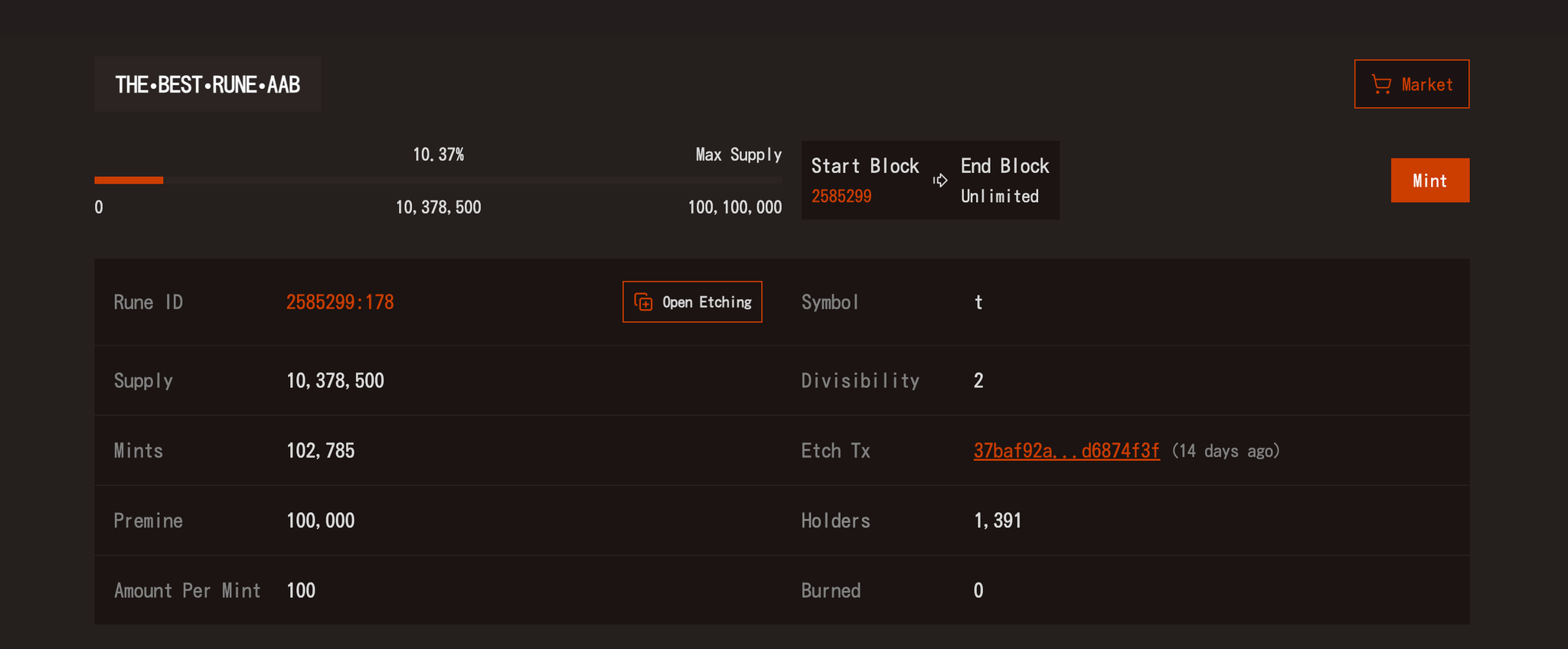 我们可以在 Explorer 界面找到已经部署好的符文,可以看到每一个代币的进程,选择正在进程未到 100%的代币。