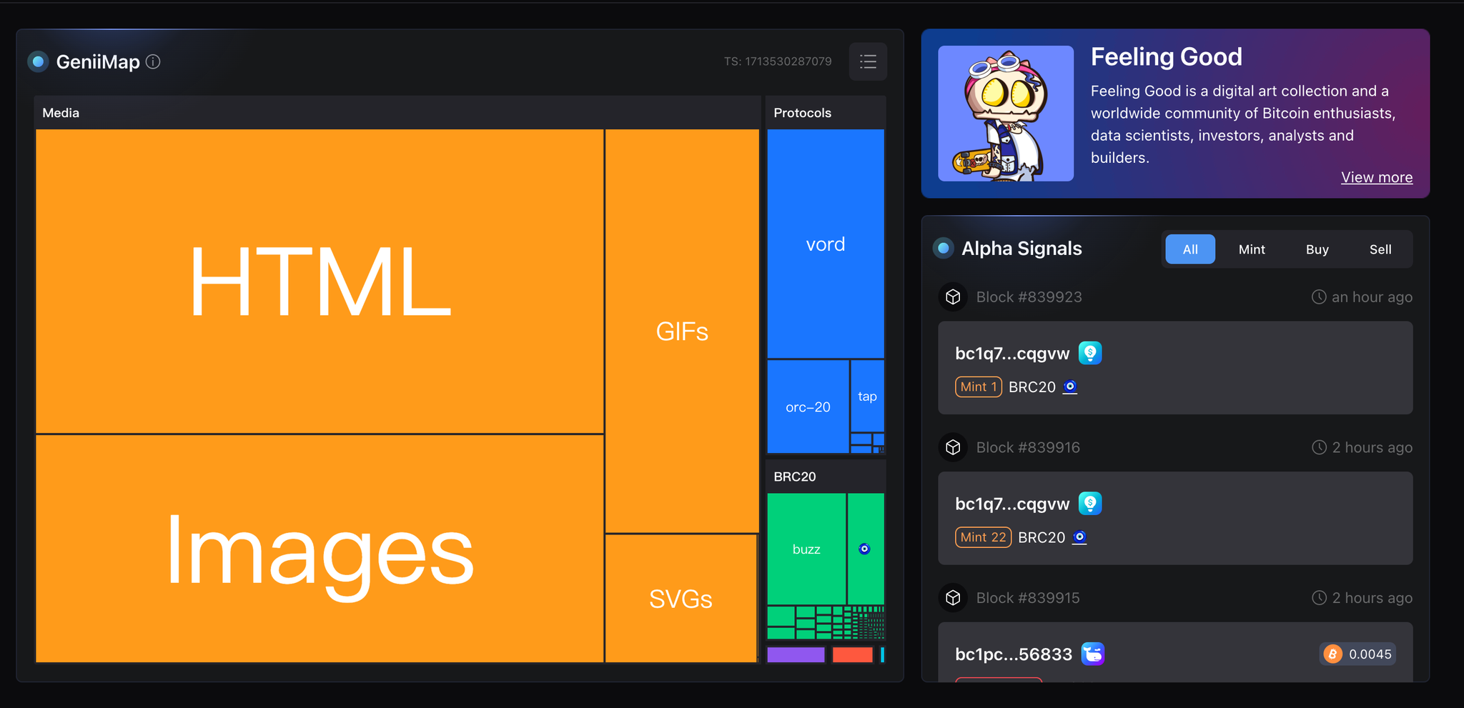 @GeniiData 的 Ordinals 看板一直是十分好用的工具,可以看到链上在打什么,各协议目前交易量的大小都可有看到,以及聪明钱的追踪,尽管很多代打平台也有自己的数据看板,但GeniiData是目前市场上公认相对更清晰好用的专业比特币数据看板平台。