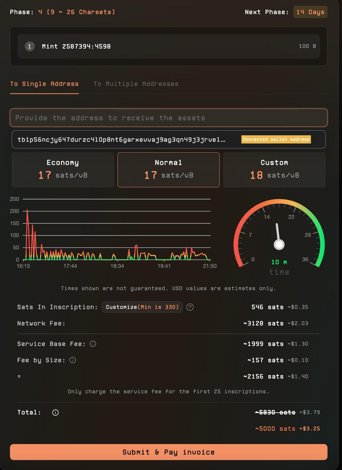 随后在 To Single Address输入自己的 bc1p 地址,一般点击一下会自动出现自己连接好的地址,选择 gas 的时候一般要去到 mempool 中观察目前的块以及上一个块的矿工费进行调整,如果想要打到的话还是应该调高一些。