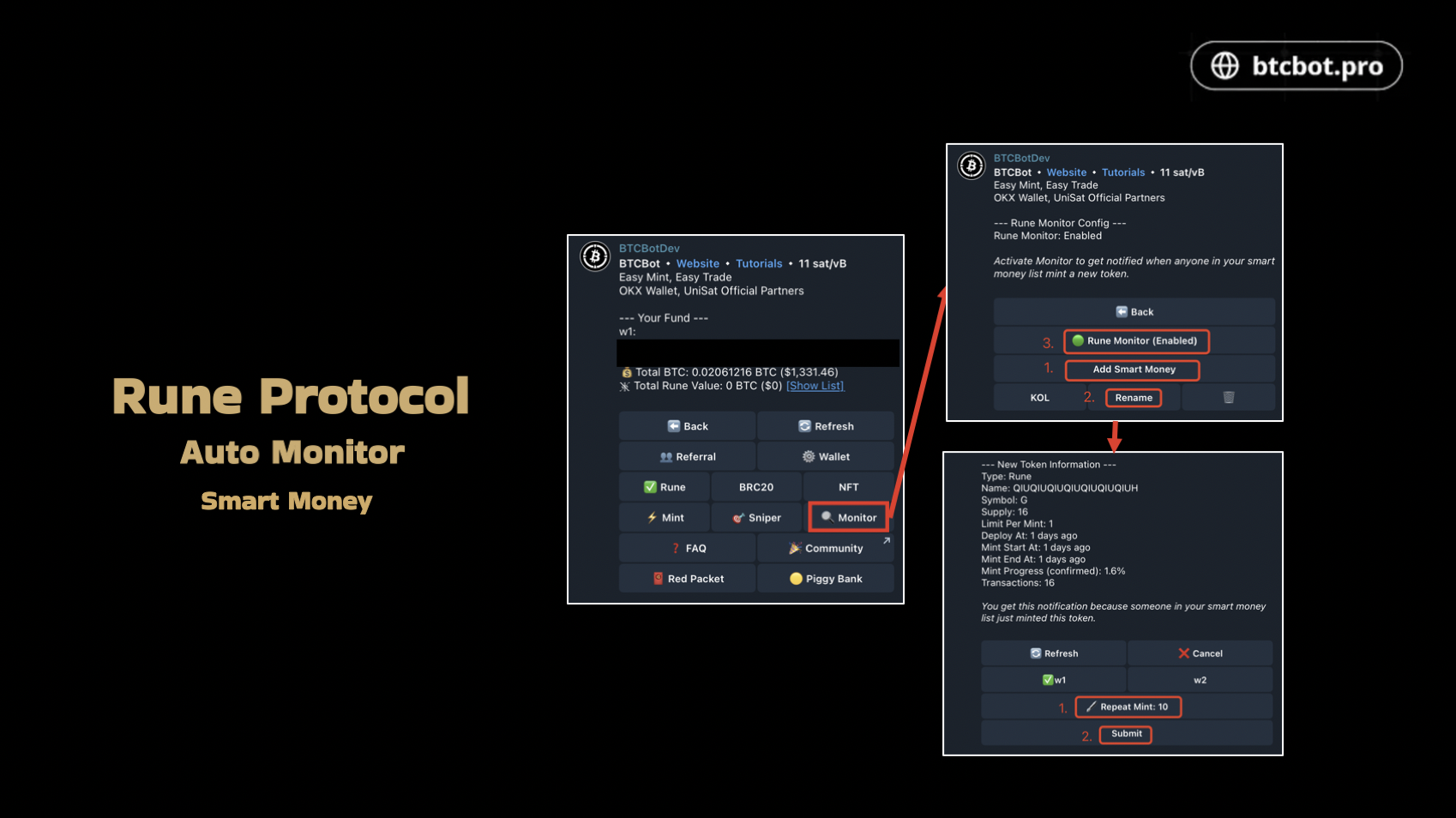 BTCBot 的自动监控(聪明钱)功能将实时监控比特币上的所有 Rune 代币进行通知:可以将聪明钱的bc1p 或 bc1q 地址添加到监控列表。再次按下“符文监控”按钮,使其变为绿色,表示该功能现已激活。