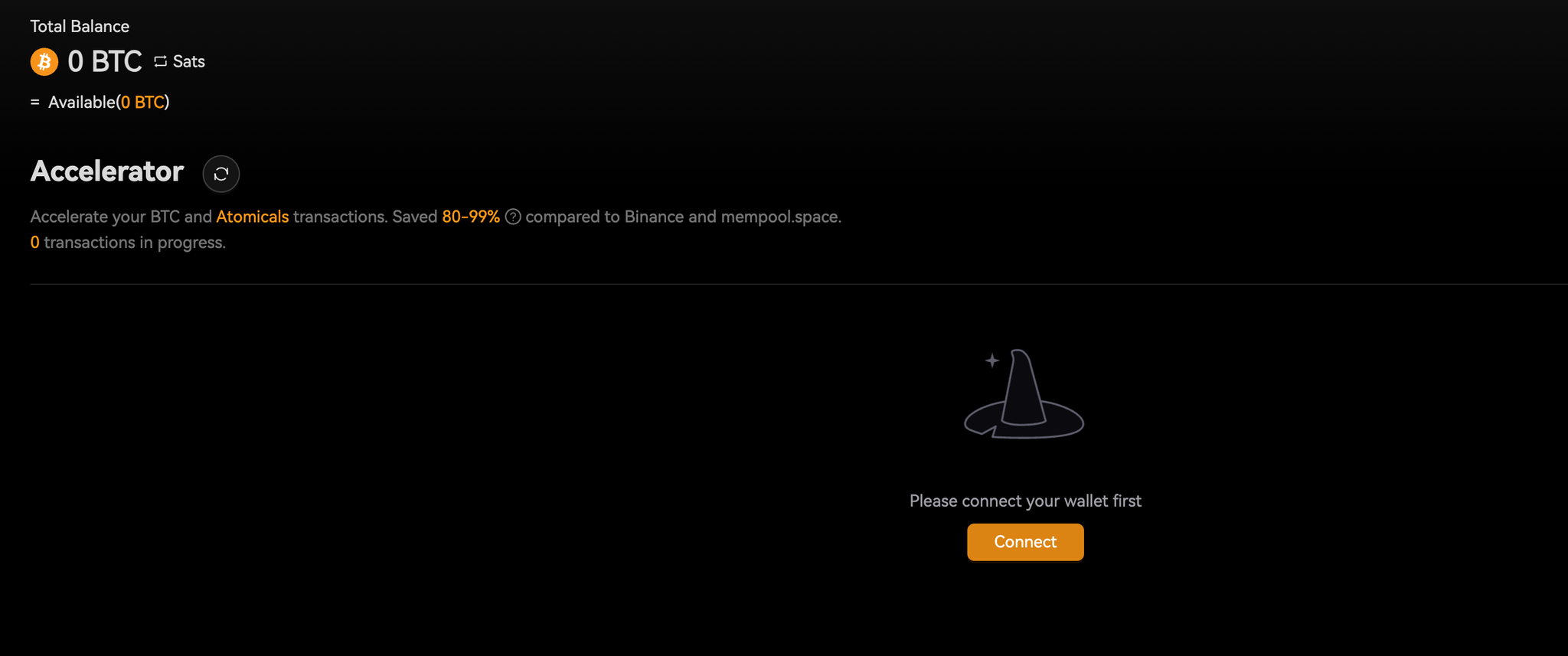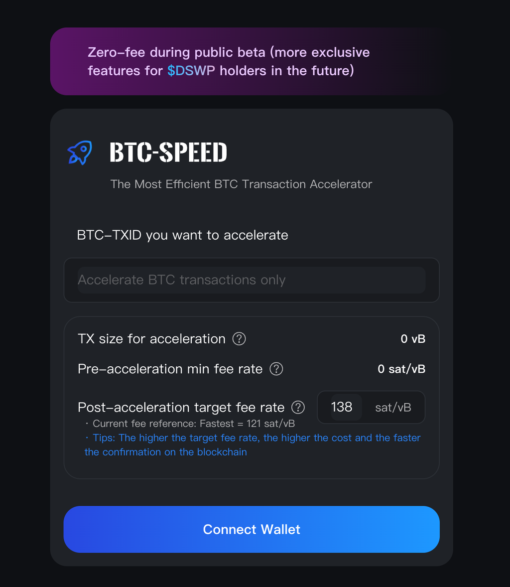 @wizzwallet 的官网中有这加速 BTC 交易的功能,只需要连接钱包,选择还在mempool中的交易会显示加速后需要补充的矿工费。