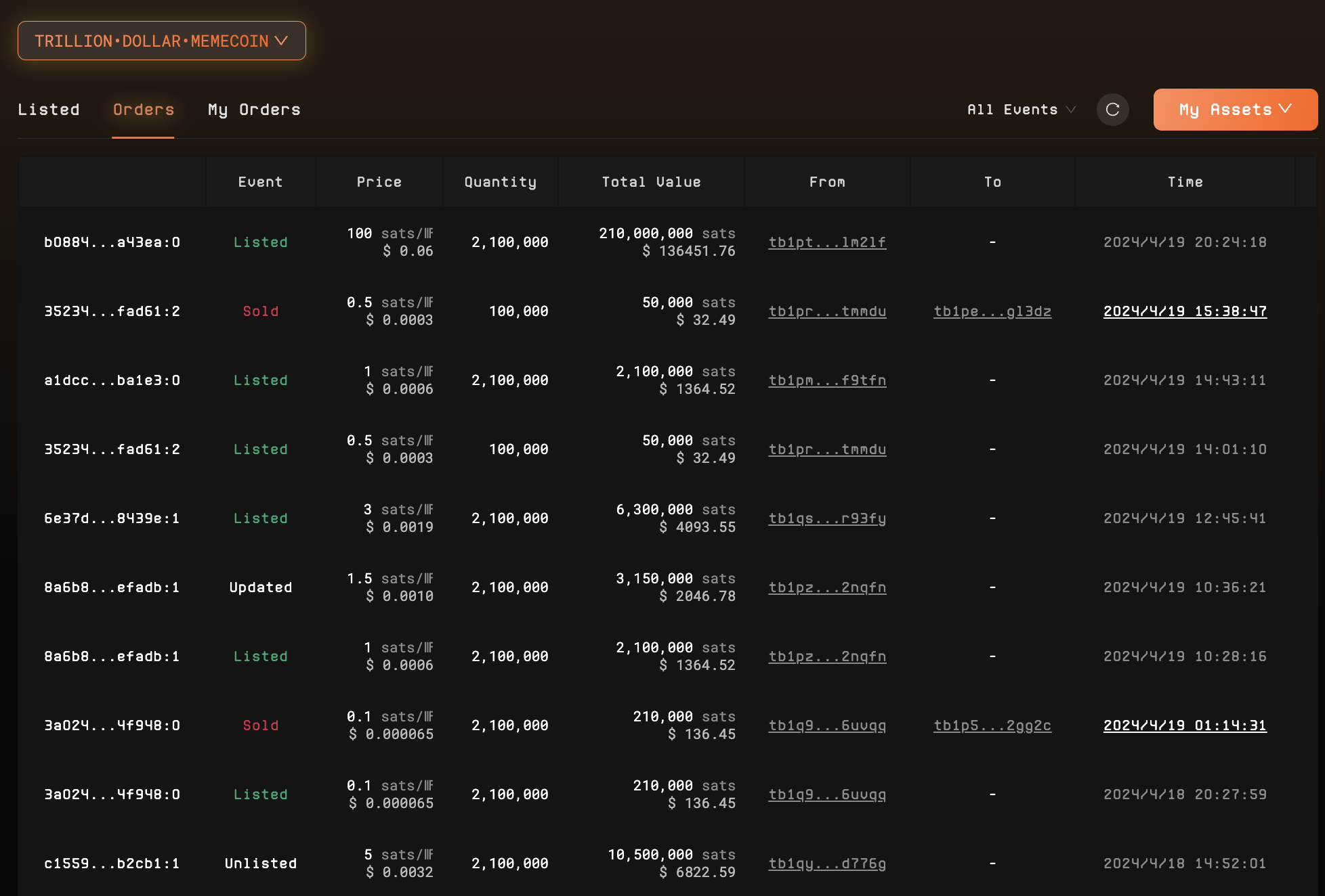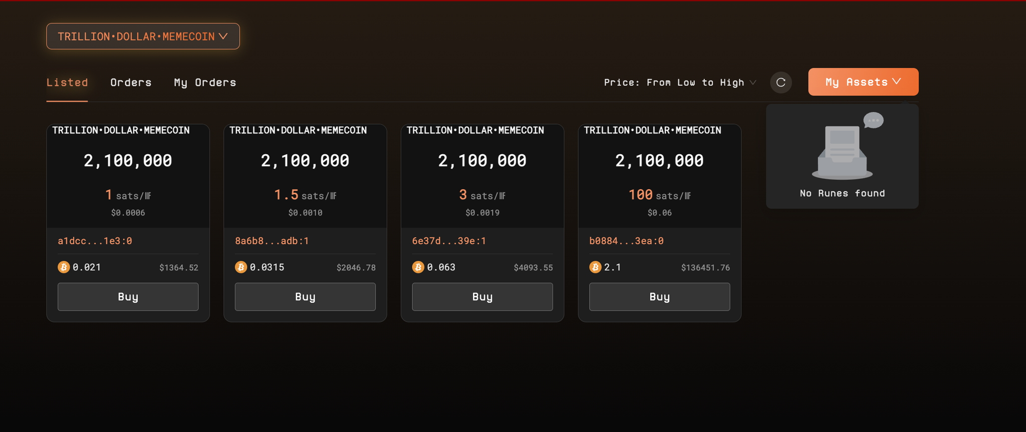 等到自己有符文资产上架卖掉或者想去交易市场直接购买符文的话,直接进入 marketplace 界面,选择想要购买或者出售的代币即可,与之前的 BRC-20流程一样。在 Order 中可以看到交易记录。