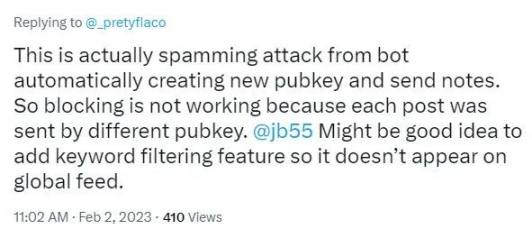 对于这种情况。Damus 创始人 William Casarin 在推特互动时透露,针对 Damus 近期出现的机器人垃圾邮件攻击等问题,将很快上线关键字过滤功能,来屏蔽首页的垃圾信息。