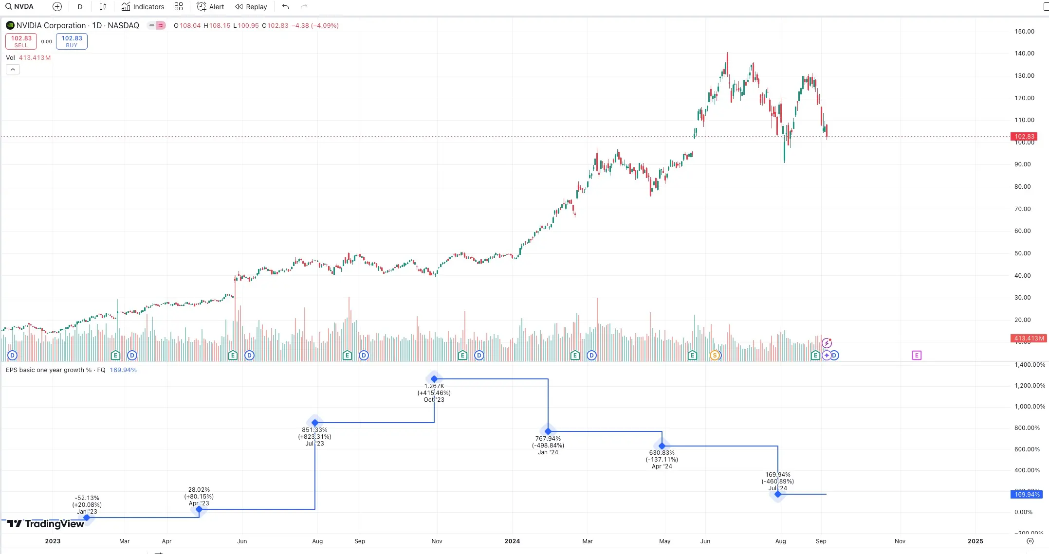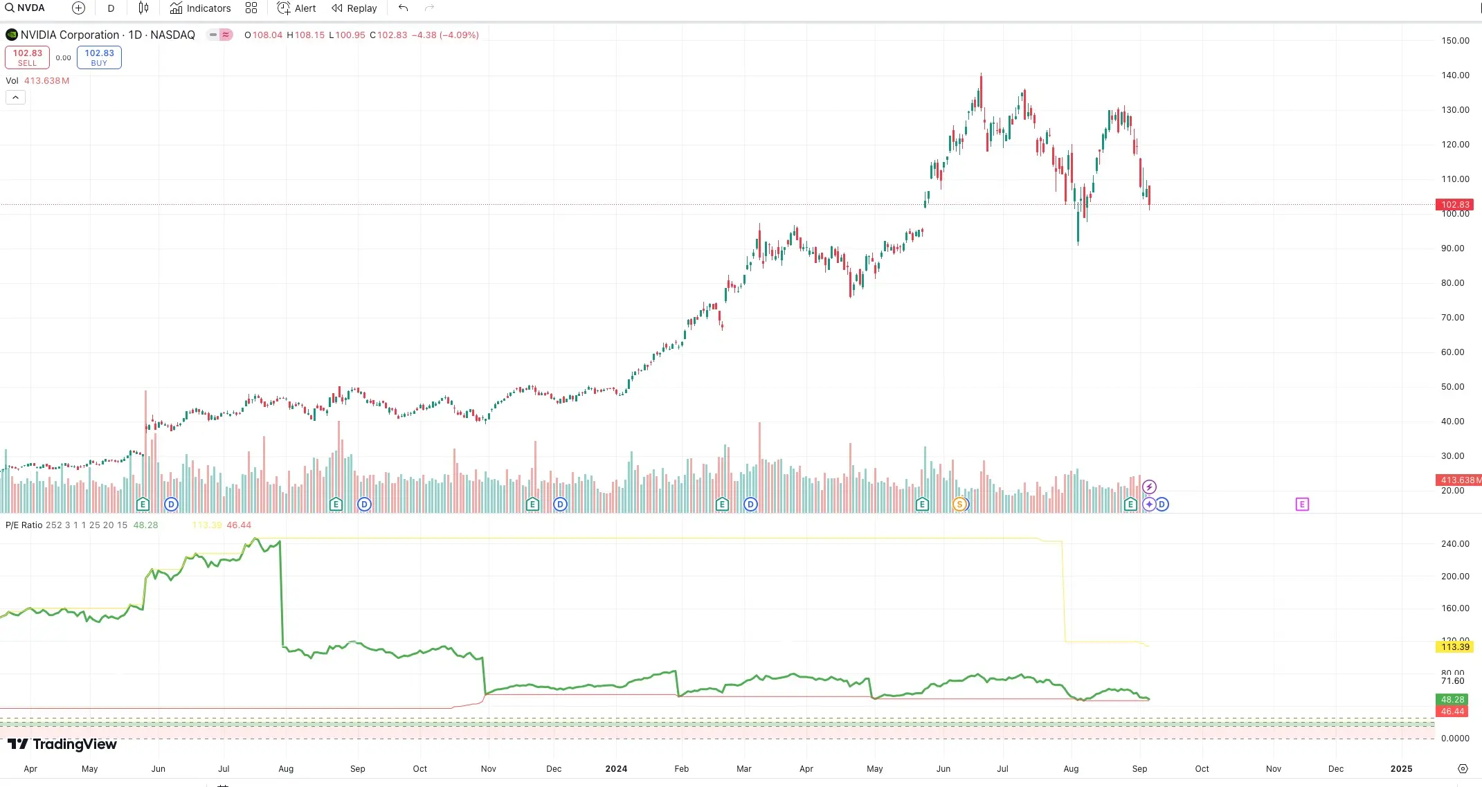 可以说本轮牛市的核心驱动力就是以英伟达为代表的AI板块的增长,在8月29日公布了2024年Q2财报,虽然依然呈现了增长的态势,但是却引发了市场的抛售,核心原因在于EPS增长率的加速下滑,引发了恐慌,市场开始杀估值。在这里稍微解释一下背后的逻辑,通常情况下,股票的价格是市场对该公司的估值的反馈,通过各种财务数据、预测和市场信息来评估资产的价值。股票估值的核心目标是判断一家公司是否值得投资,价格是否与其潜在的盈利能力或资产状况匹配。一个最基础的估值方法就是计算市盈率(P/E Ratio),并结合对公司所处行业的平均水平进行比较,从而判断当前股票价格是被高估还是低估。市盈率的计算方法是用股票的价格除美股收益,也就是EPS,因为股票的核心价值是分红权。