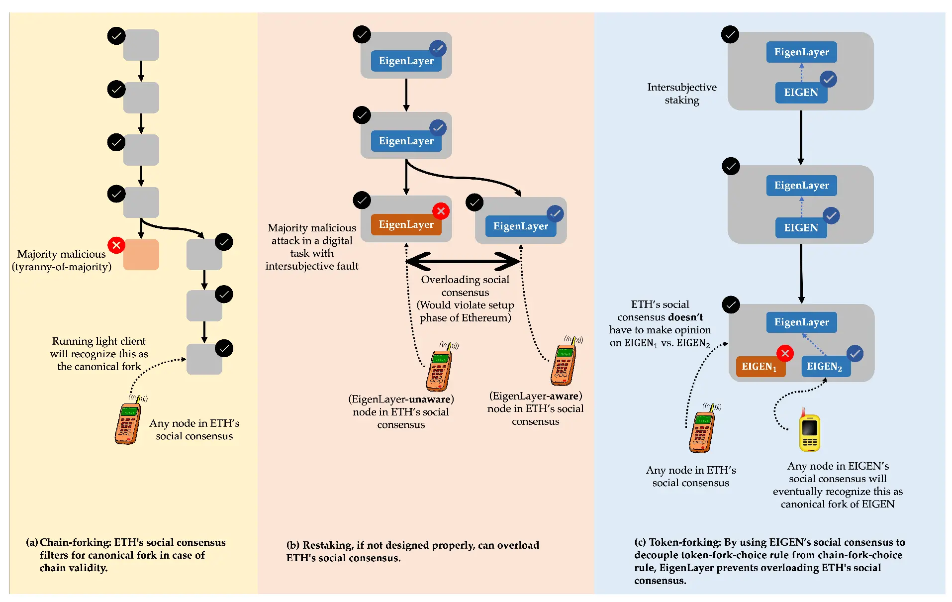 那么可分叉可以带来的所谓社会共识能力究竟是什么呢,它又是如何避免多数人暴政问题呢?首先EigenLayer指明,灵感来自于对ETH PoS共识的研究。其认为Ethereum的安全性来自两方面: