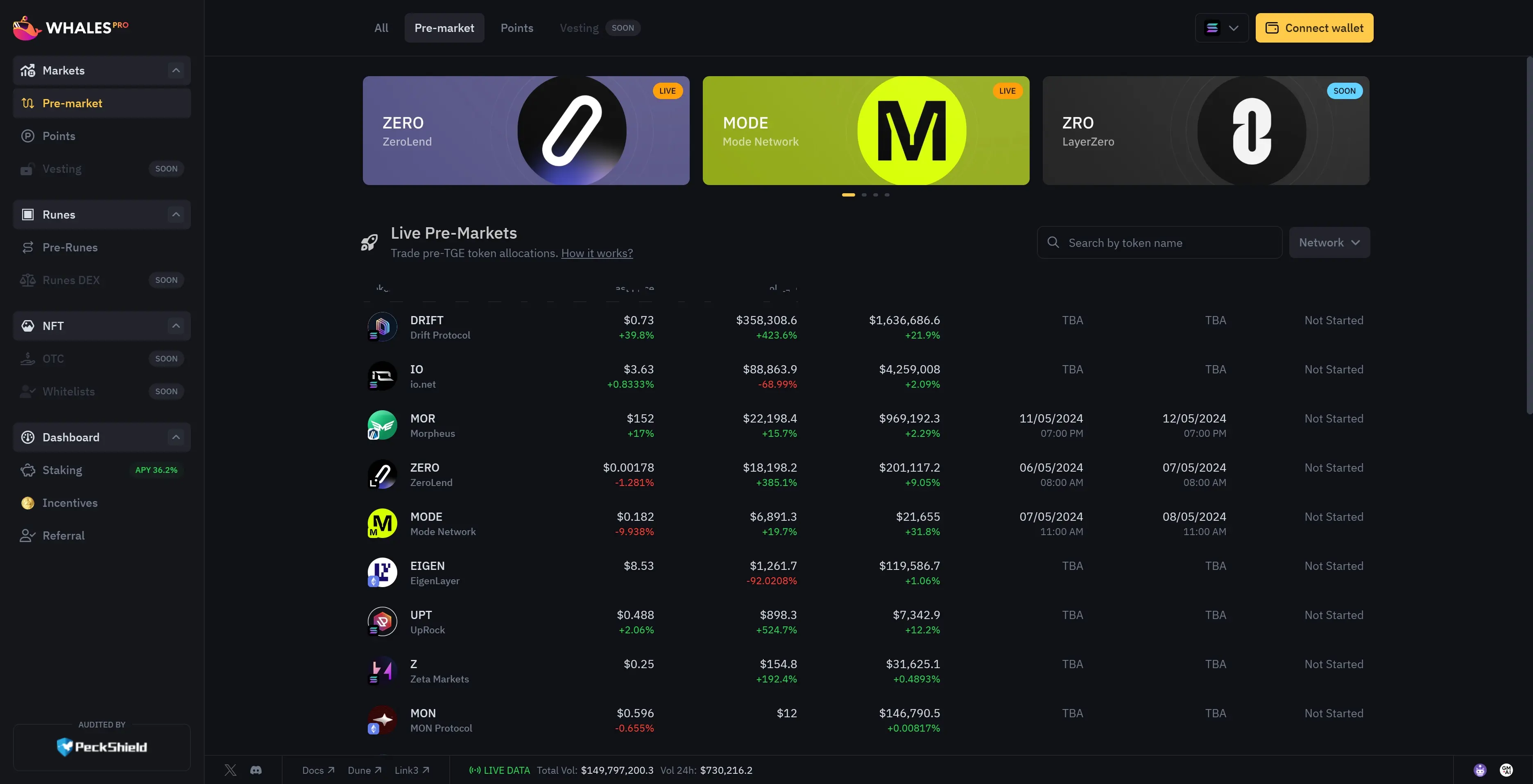 Pre Market 让用户能够在代币 TGE 前即可通过 Whales Market 进行交易。TGE 前代币分配的 P2P 交易长期以来一直是一种常见的做法,主要通过社交团体、私人消息和几个中心化平台进行。Whales Markets 以智能合约促进了买卖双方在链上达成交易。