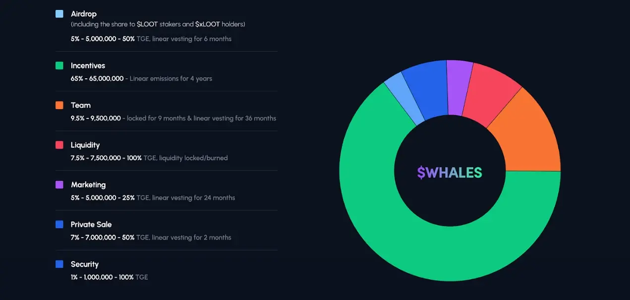 $WHALES 主要用于扩展 Whales Market 的增长。总供应量为 100,000,000 枚,没有进行任何公开预售。最初的流动性由 LootBot Treasury 提供,因此也追溯性空投了一部分给 $LOOT 抵押者和 $xLOOT 的持有者。