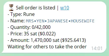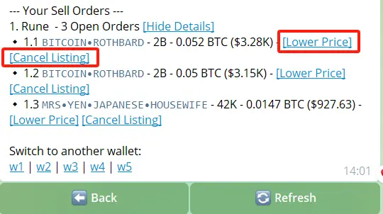 备注:已经挂单的订单(或者同一个 UTXO 里面有两个符文 Runes 代币,也有“锁”,用BTCBot 蚀刻 mint 不会出现这种情况),前面会有个“锁”的标志。建议挂一个高的价格,而后降价,而不是取消订单再挂出去,因为区块链上取消订单会产生 gas 费,降低价格则没有 gas 费用。