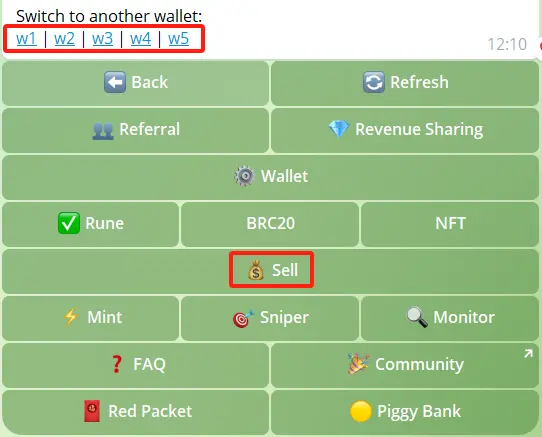 注意:在 BTCBot 各个界面都可快速切换不同钱包,点击钱包名称(比如 W2),点击对话框的 Start 按钮,即可完成切换,方便交易 Runes 符文。