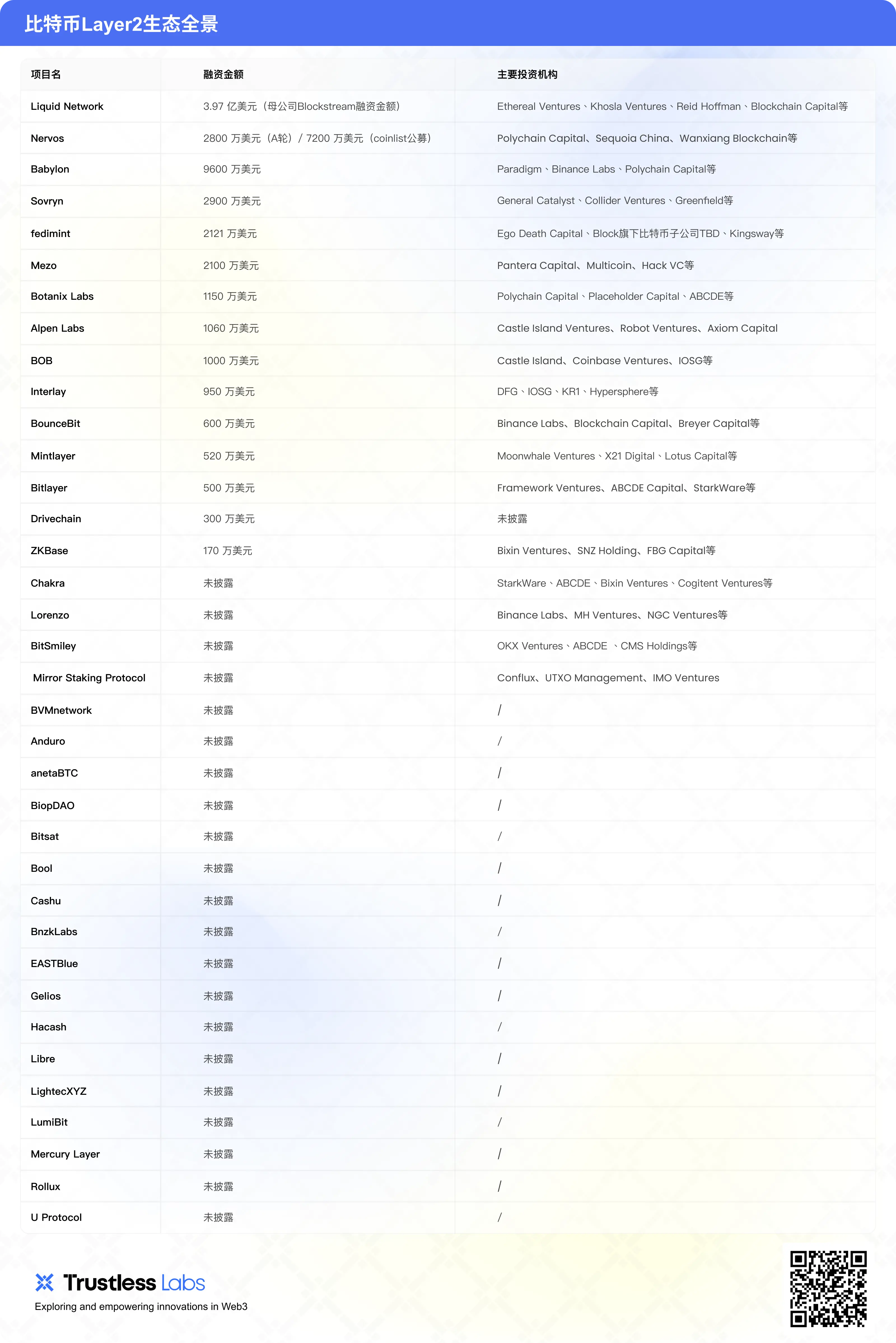 BitLayerLabs 是第一个基于 BitVM 的比特币二层网络(L2),支持多虚拟机和 EVM 兼容,采用 Op-Rollup 技术。2024 年 3 月 27 日宣布完成 500 万美元种子轮融资,由 Framework Ventures 和 ABCDE Capital 联合领投。其他参与机构包括 StarkWare、OKX Ventures、Alliance DAO、UTXO Management 等。5 月 19 日获得 OKX 战略融资,金额未披露。