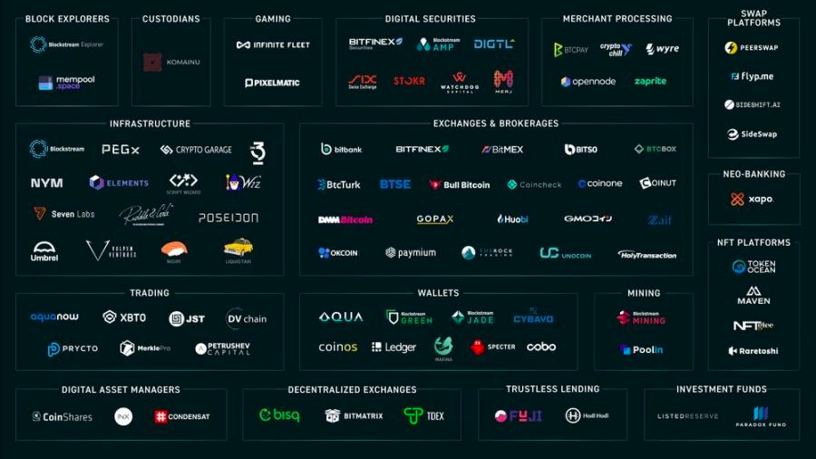 生态项目包括钱包 AQUA Wallet,DeFi 产品 Bisq、Peach Bitcoin、Boltz,NFT 项目 tokenocean,以及 SideSwap、Debifi。