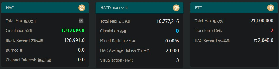 比特币可以单向转移到 Hacash 中,保持其所有权和原生价值属性,总供应量保持在 2100 万枚,并以最小的中本聪单位在 Hacash 中流通。BTC 转账导致 HAC 的创建,HAC 的发行量逐渐减少,在 105 万 BTC 转账后,每 1 BTC 转账仅产生 1 个 HAC。HACD 的总供应量约为 1677 万,通过采矿和 HAC 招标产生,采矿难度逐渐增加,最大日产量为 58,预计所有 HACD 将需要 800 年,但可能永远不会生产出所有的 HACD。