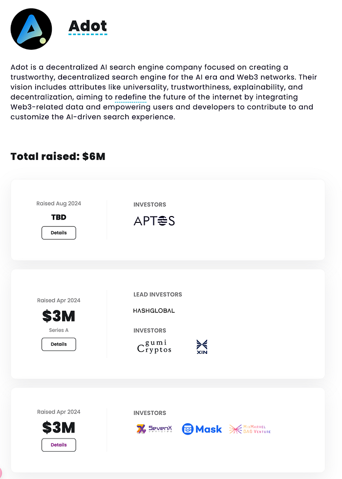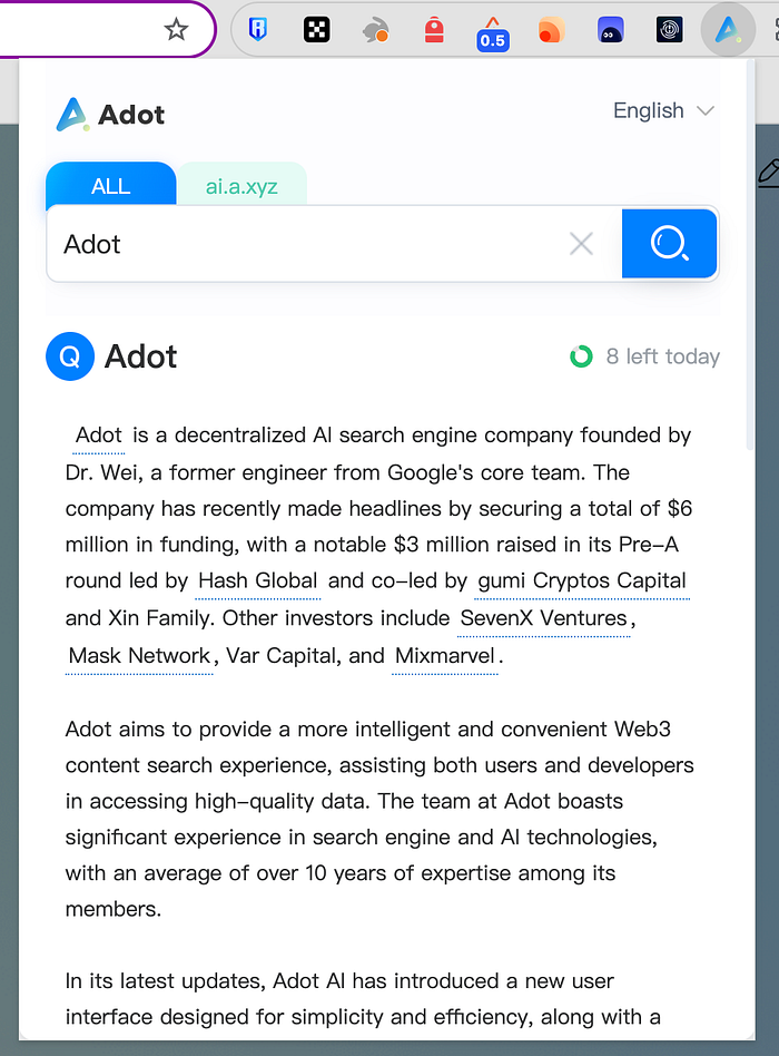 在这样的背景下,一个名为Adot的项目应运而生。自2022年成立以来,Adot已完成多轮融资,累计融资额达600万美元,显示了投资者对这一创新项目的信心。Adot正在用AI和区块链技术重新定义搜索的未来,旨在为Web3时代提供全面的搜索解决方案。