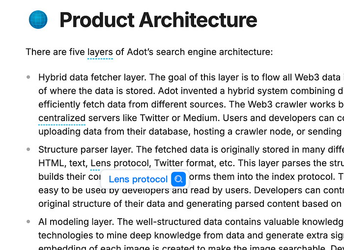 - 全面的Web3数据覆盖:Adot不仅索引传统网页内容,还涵盖了区块链上的交易数据、NFT元数据、社交媒体帖子等Web3相关的各类信息。它甚至能够访问一些传统搜索引擎难以触及的”深网”数据。这种全面的数据覆盖使Adot成为Web3世界的全能信息入口。