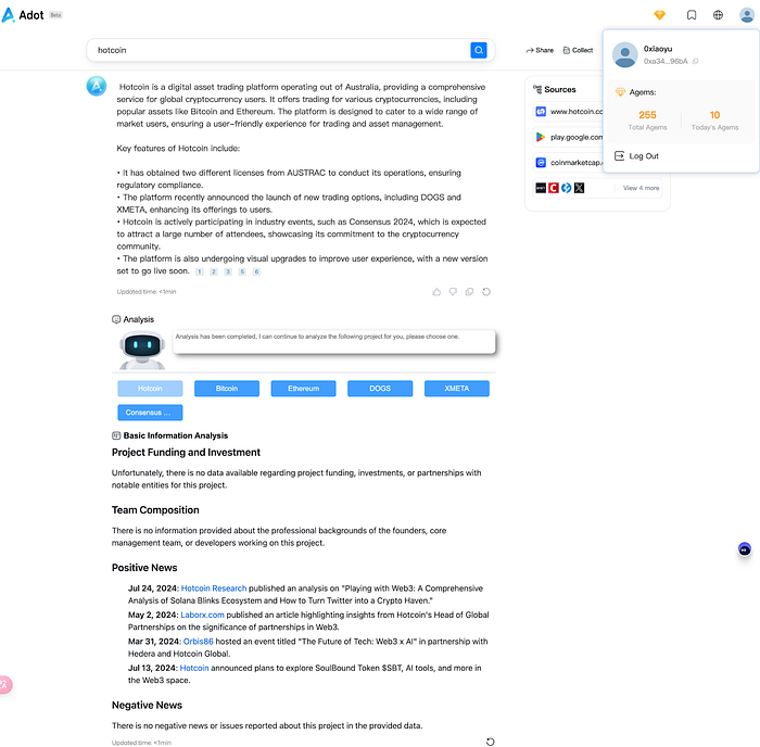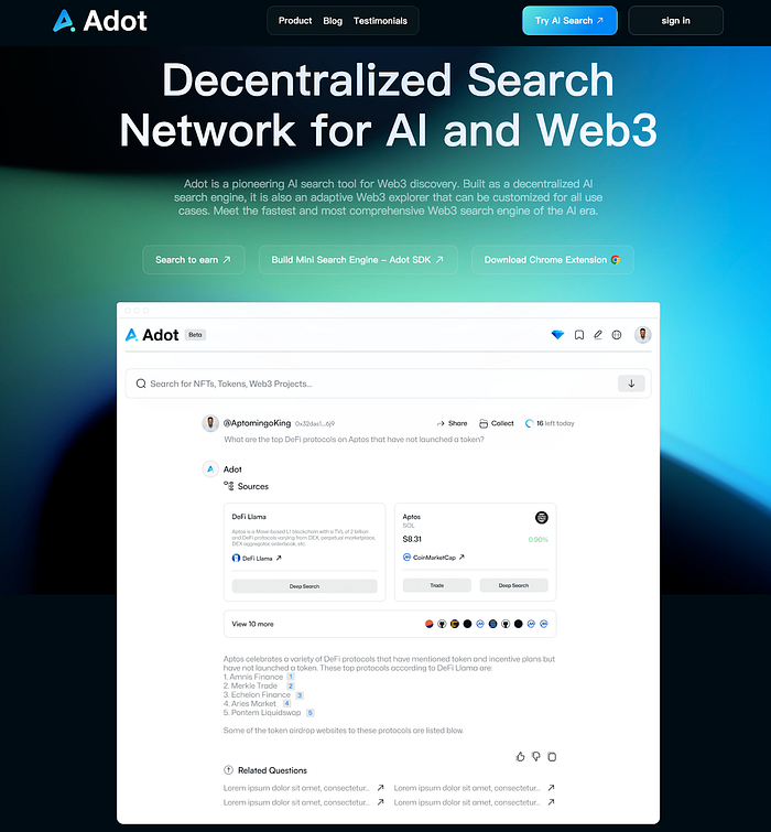 - AI驱动的智能搜索:Adot将先进的AI技术应用于搜索,有潜力提供更精准、个性化的搜索体验,这是传统搜索引擎和大多数Web3项目所不具备的。