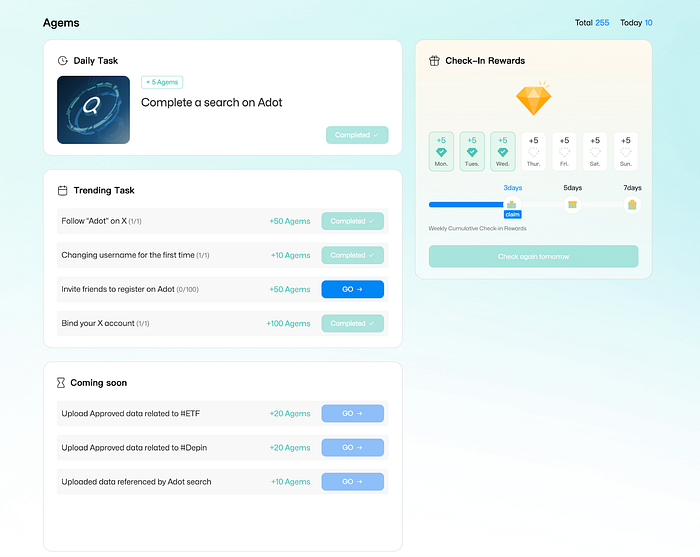 - 日常搜索:访问Adot官方网站(https://ai.a.xyz/#/?code=Z4pcx0),使用搜索功能并获得Agems积分奖励。Agems是Adot生态系统中的积分,未来可能转化为代币或用于兑换其他权益。