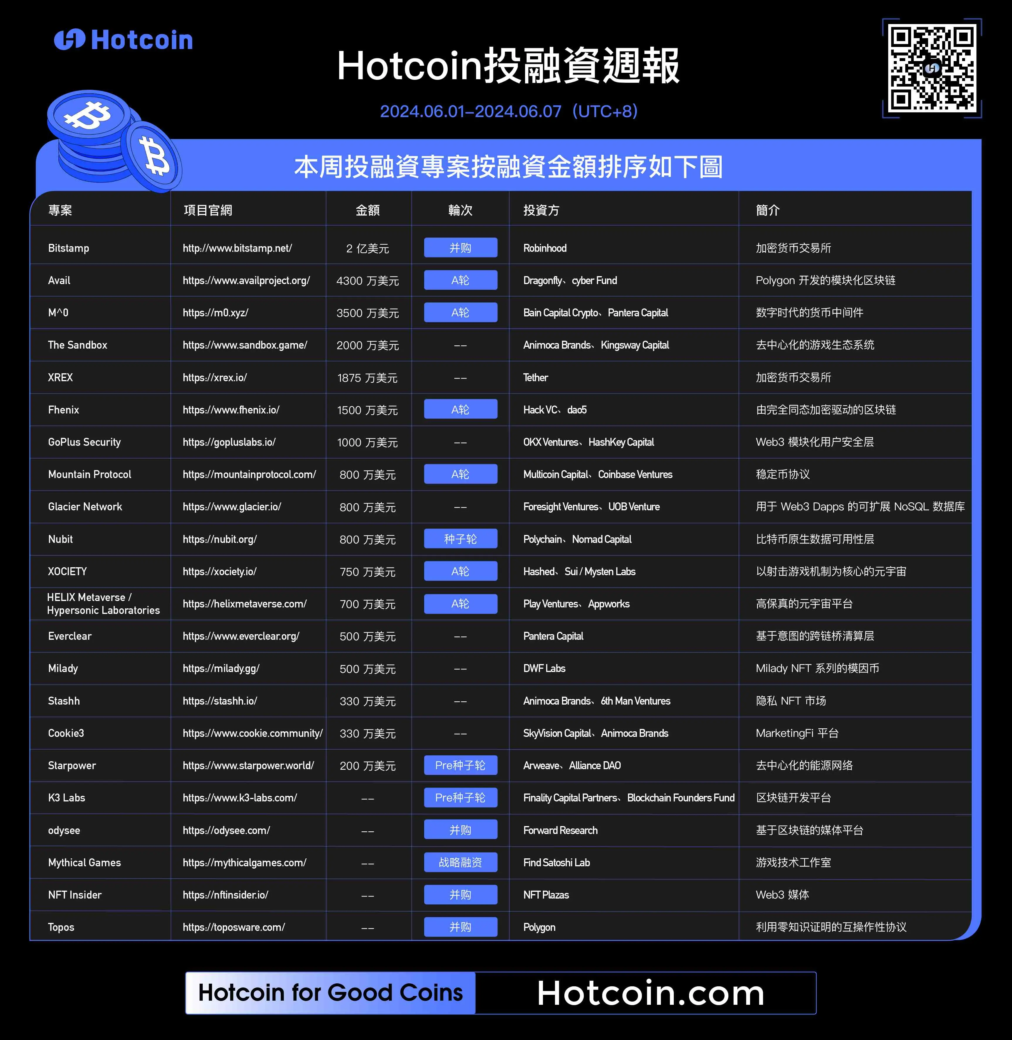 本周投融资专案按融资金额排序如下图: