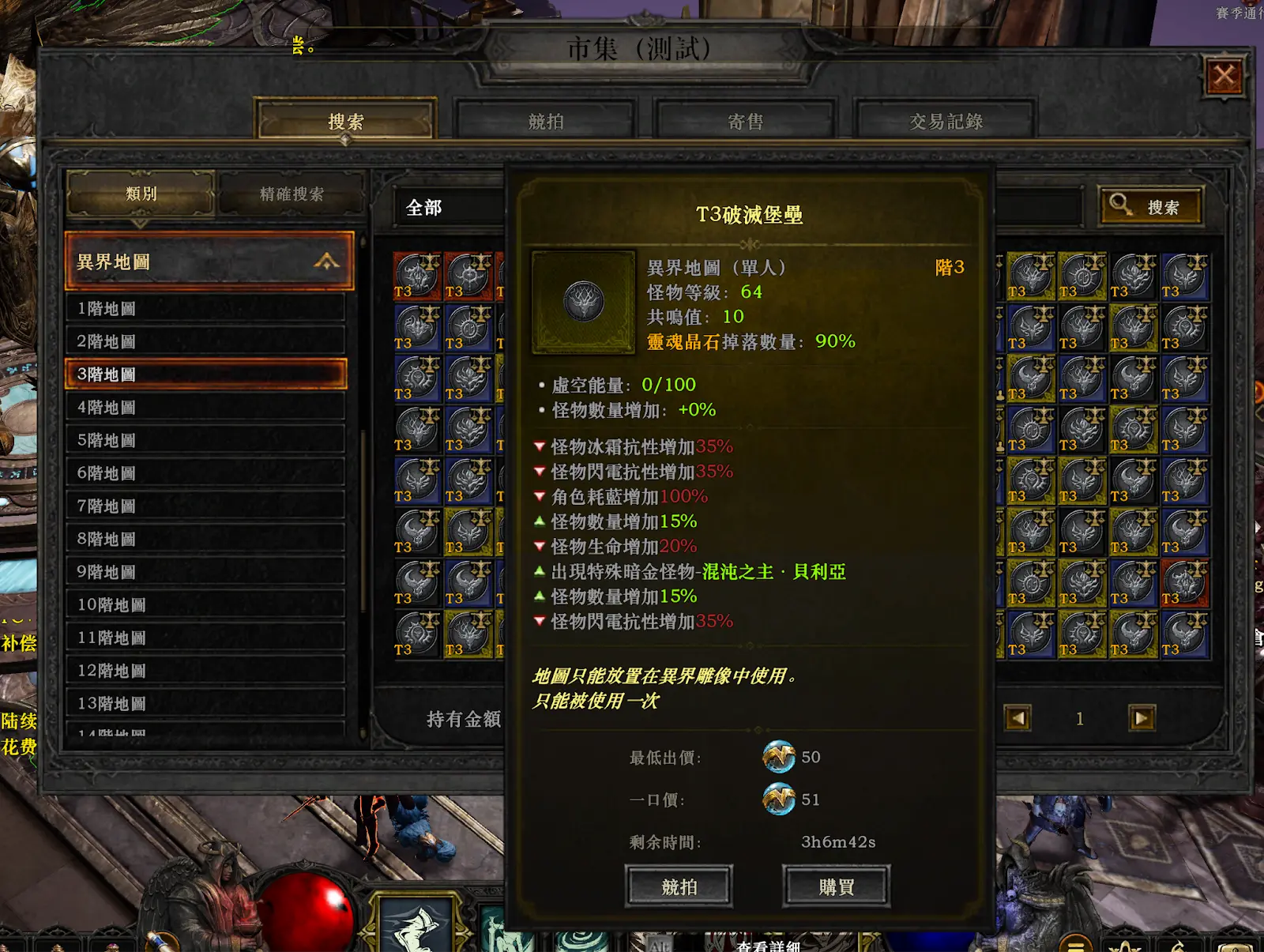 异界地图是参与虚空异界活动的基础,玩家需要放置地图才能进入副本。地图根据等级分为T1至T18,随等级提升,怪物等级、共鸣值需求和晶石掉落量增加。