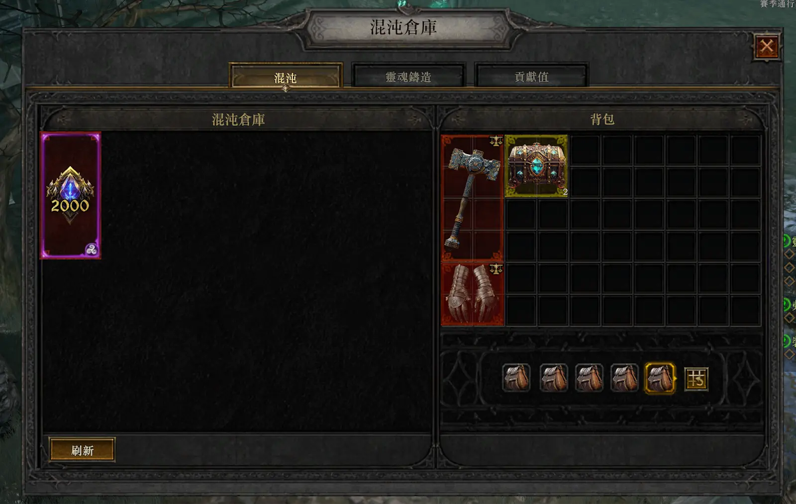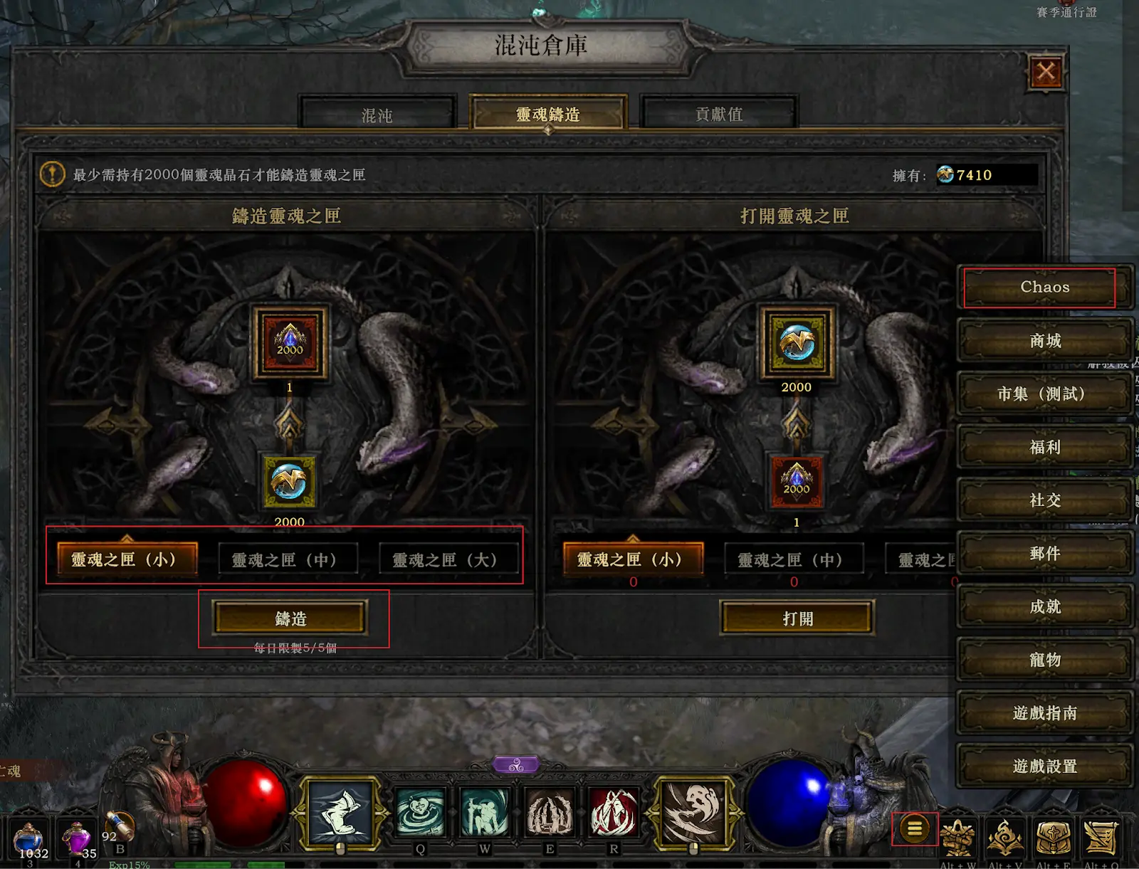 当我们的灵魂晶石数量到达2000个时就可以进行变现,可以在游戏菜单中选择chaos-灵魂铸造,选择对应的数量进行铸造,铸造之后我们的背包中就会有一个灵魂之匣,我们将其移动到混沌仓库。