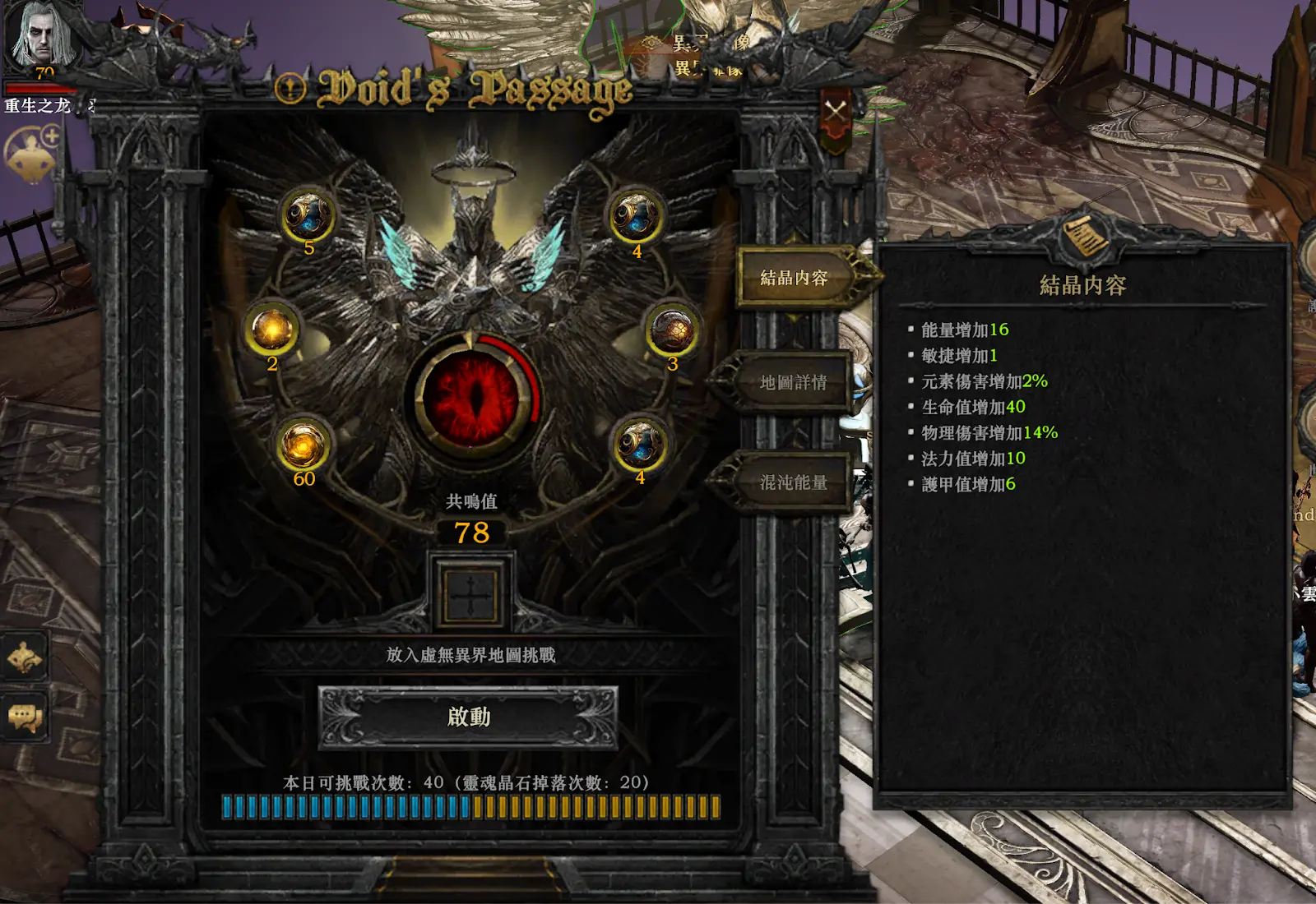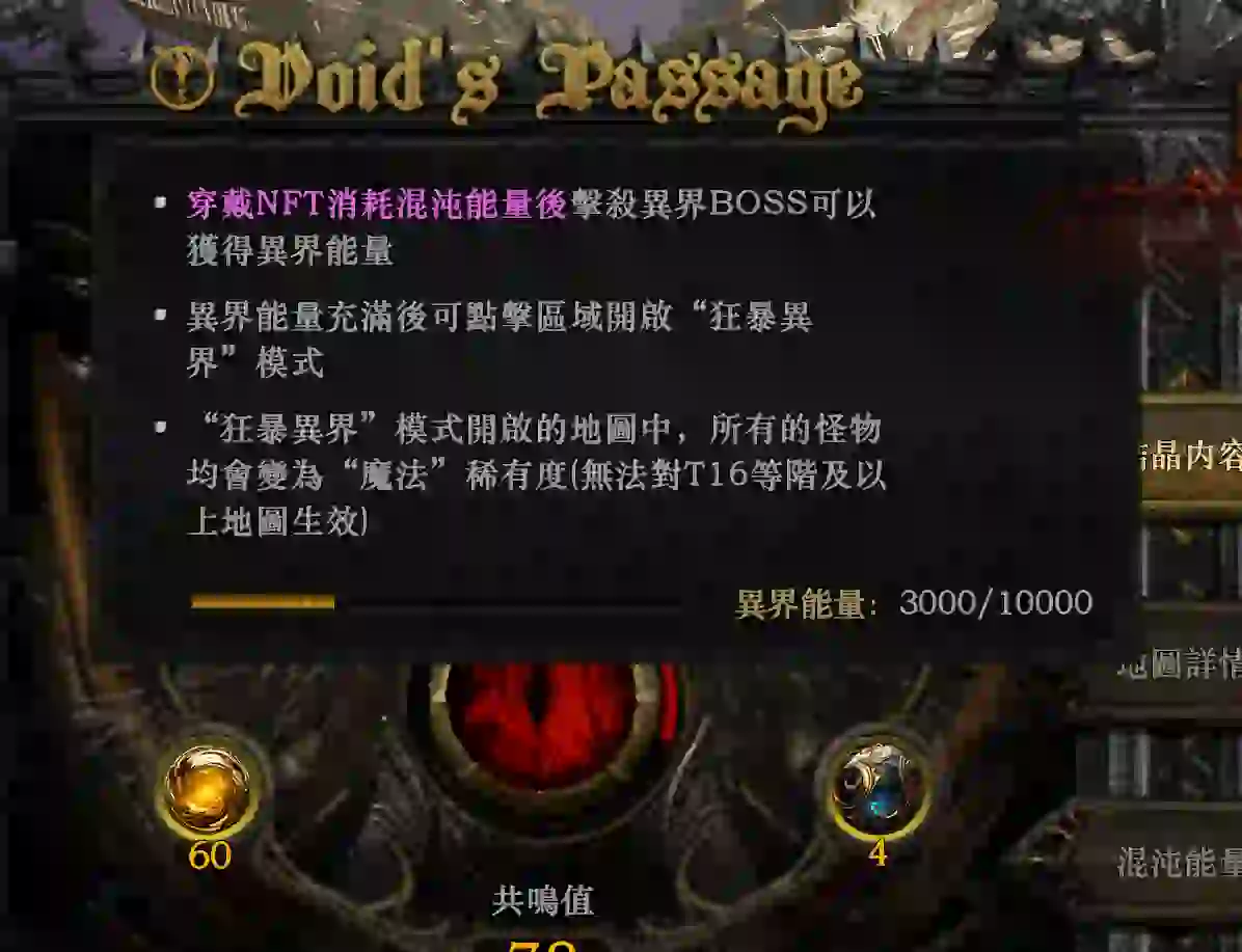在虚空异界中,穿着混沌装备并击败精英怪、首领怪和BOSS有机会获得灵魂晶石。选择击败BOSS能够更快地获取晶石,并节省时间。此外,收集虚空结晶可以提升共鸣值,获得角色属性加成。你可以在虚空绘图师处获取初始虚空结晶,同时每天也会刷新地图可以进行购买。