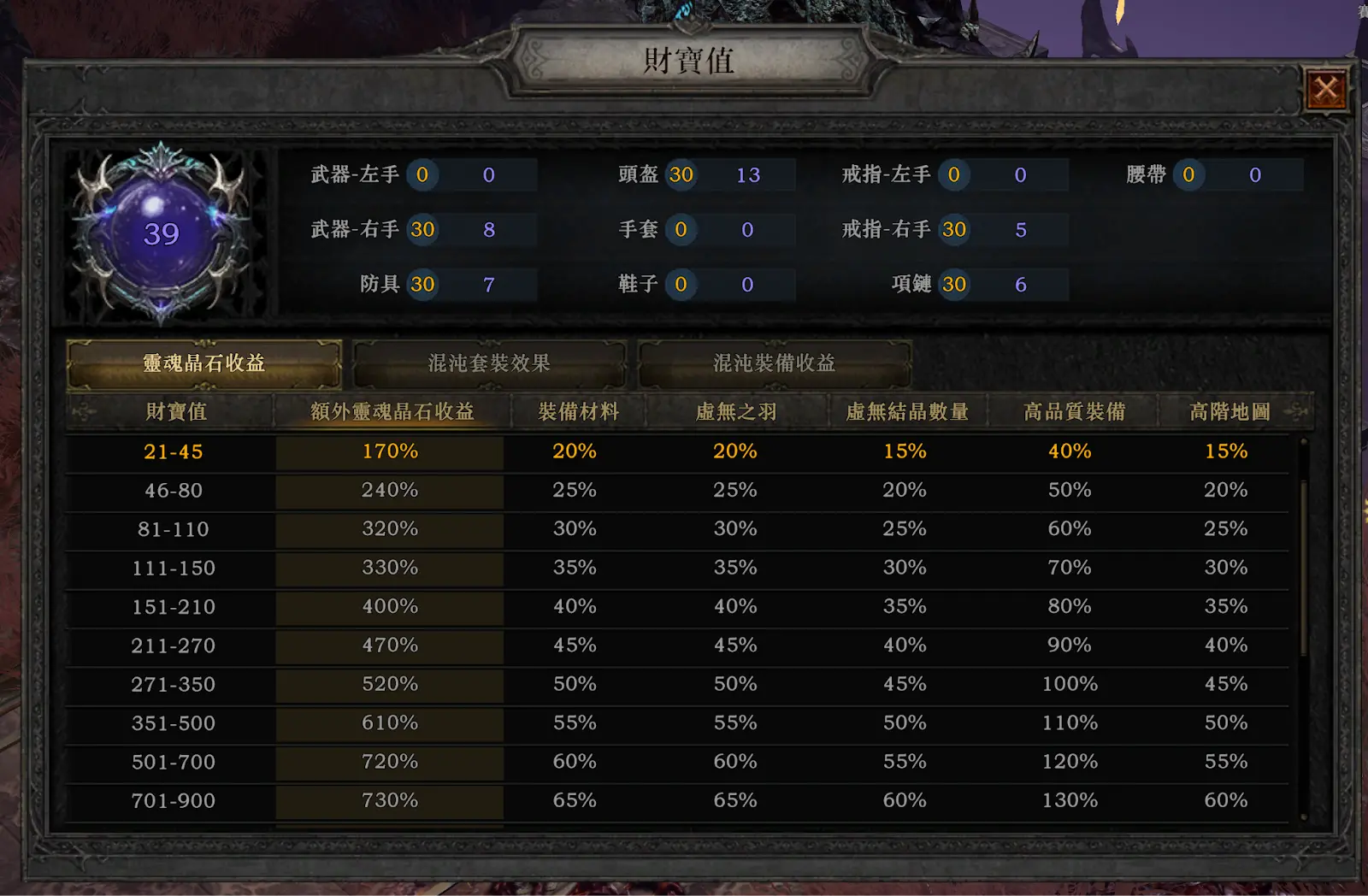 全身财宝值阈值 在选择装备时,全身财宝值21、81和120是最佳阈值,考虑奇数数量的同级别装备更有利。