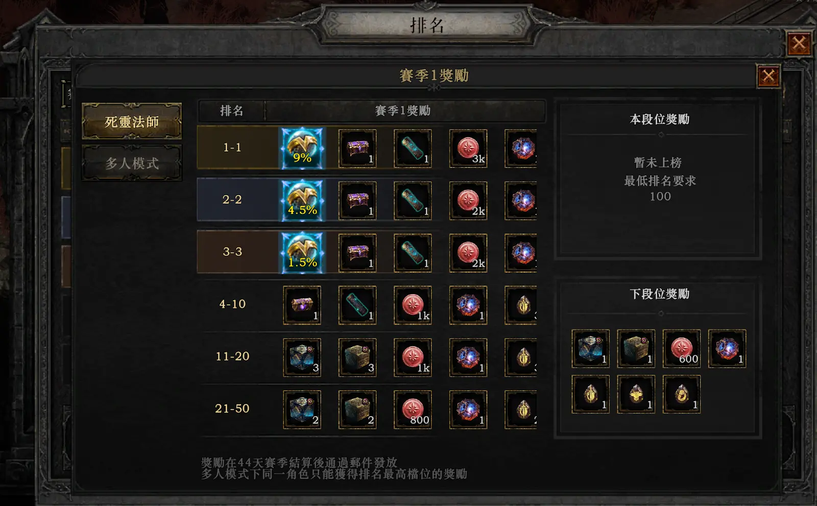 此外,游戏还有排行榜奖励,每个赛季结束都会奖励大量的灵魂晶石和其他奖励,同时我们也可以参考天梯排行榜玩家的技能加点和装备打造。