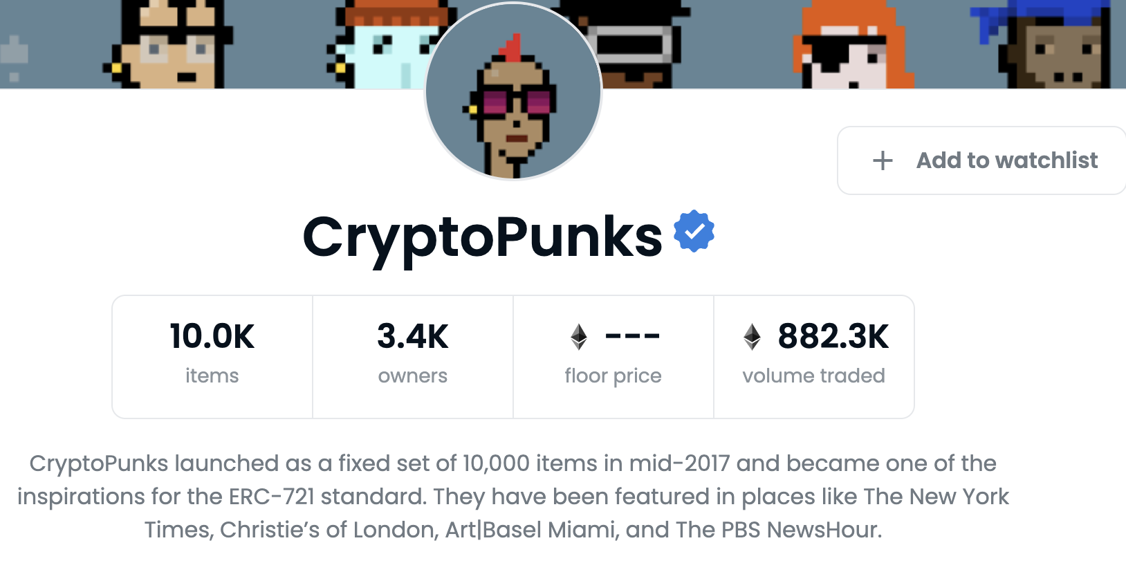 CryptoPunks 有 10000 个,也算是数量很多的 Collection 了