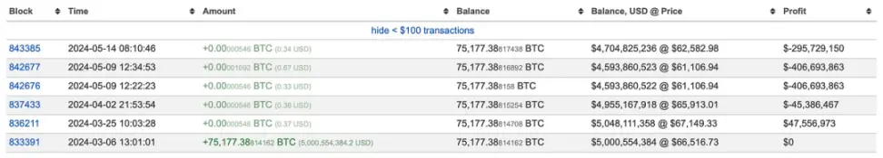 由于钱包之间的资金流动,大额比特币持有者名单是不断发生变化的。截至 2024 年 5 月 15 日,根据区块链浏览器的数据显示,前十个地址持有的比特币数量从 69370 BTC 到 248597 BTC 不等。