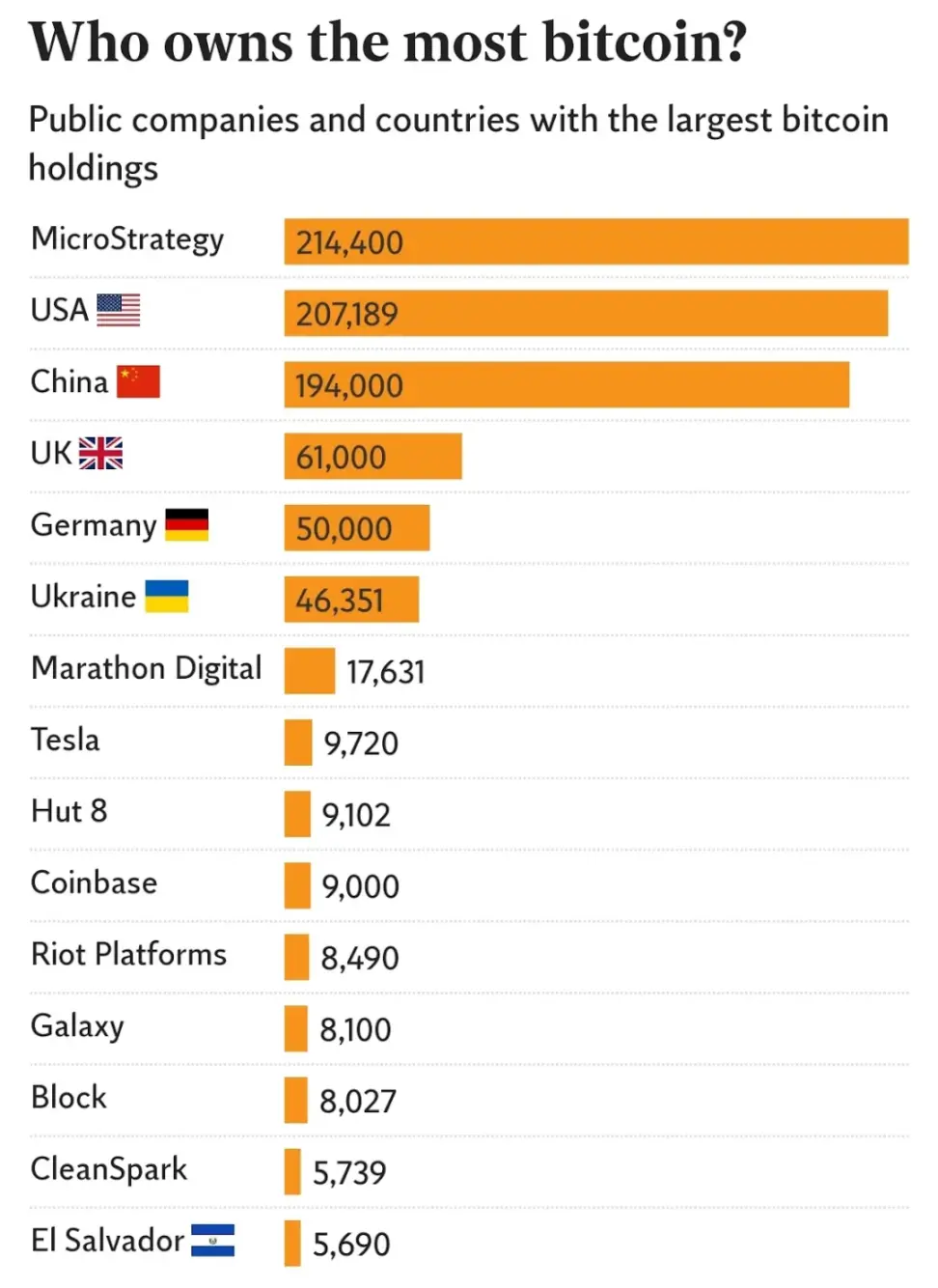 截至 2024 年 5 月 6 日的企业和国家比特币持有量排名。来源:Independent