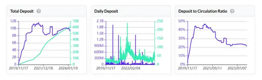 从历史情况来看,在2021年牛市期间,最高锁仓了达到大约120亿枚,此后下跌,最低在80亿枚左右。因此,整体看这部分持仓较为稳定。2023年底至今,新增质押有所增加。不过,从质押/流通量的比率来看,整体处于下降趋势。新增用户、新增代币没有进入质押中。