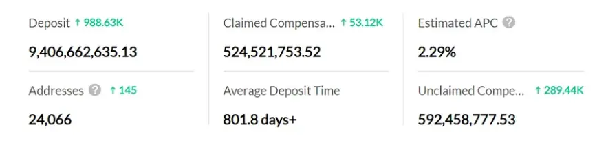 NervosDAO锁定了大约94亿枚代币,占总流通量大约21%,平均的存款时间为大约800天,属于长期持币。当前的质押收益率不高,只有2.29%,质押吸引力有限。