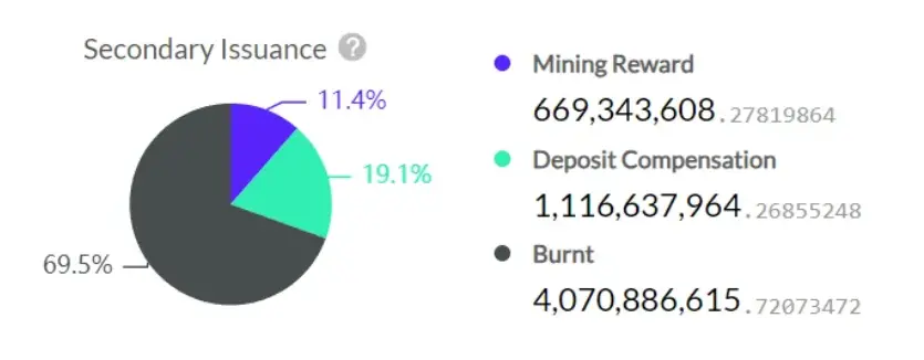 当前的具体分配如下图所示,从图中可知,二级发行一共有大约57.7亿枚CKB代币,其中69.5%的代币均被销毁,进入流通的大约为17.7亿枚。