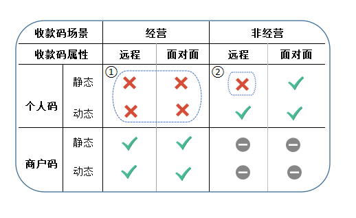 如图所示,《通知》中的两条细则,分别对①个人码 经营性收款和②个人码 静态 远程收款这两类收款码属性 使用场景,进行了细致而又明确的限制。