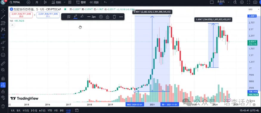 如果你经历过 2021 年的大牛市,那么,很多事情应该还会历历在目。上一轮牛市从 2020 年 3 月算起,一直持续到 2021 年 11 月,加密市场的总市值上涨幅度超过 2,500%。如下图所示。