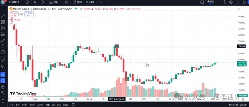 如果回顾上一轮牛市的话,其实也能够发现,BTC 大致是从 2020 年低开始上涨的,而那个时候,大多数山寨币的价格表现都不如 BTC,直到 2021 年初开始,山寨币才突然起飞。因此,也存在一种比较流行的说法,那就是每轮大牛市正式开始前,BTC(包括ETH)都会先有一个起飞的过程和阶段,这个过程中 BTC.D 会上升,山寨币的涨幅则会相对落后,待 BTC.D 到达一定的位置后(65–70% 区间时),山寨币才会爆发,然后资金开始进入轮动,各种山寨币开始飙涨。如下图所示。