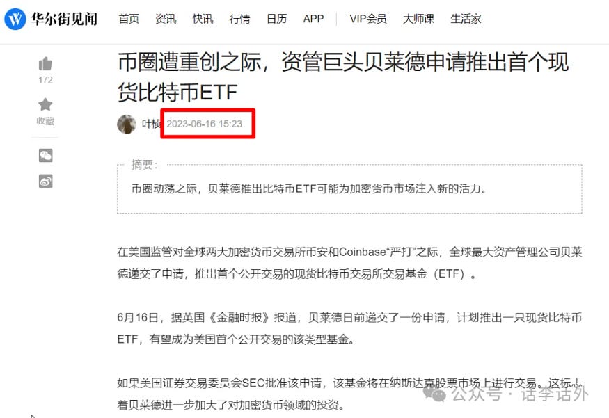 就这样,时间一晃又过去了半年,直到 2023 年的 6 月份,似乎市场的情绪又发生了一些新的变化。2023 年的 6 月份,有消息传出 BlackRock(贝莱德、全球最大的资产管理公司)申请了比特币现货 ETF。下图是当时的报道截图。