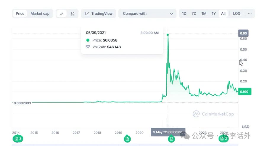 不过也有一些例外的老币,诸如 BNB、ADA、ETC、DOGE 等一些老币种则表现非常抢眼,不仅在 2021 年牛市突破了前高,甚至还有了更大的涨幅。尤其是 DOGE,在马斯克持续的强奶下,也成为了 2021 年牛市中最亮的崽之一并火速出圈,价格从 0.002 美元附近飙涨到了 0.63 美元附近。如下图所示。