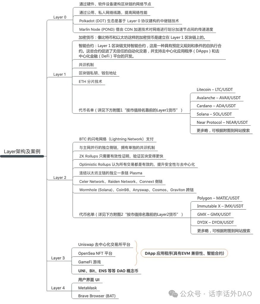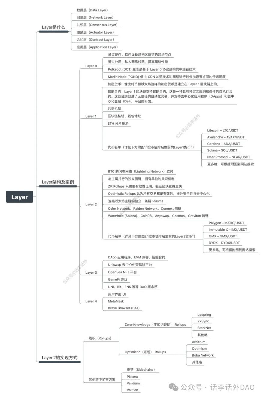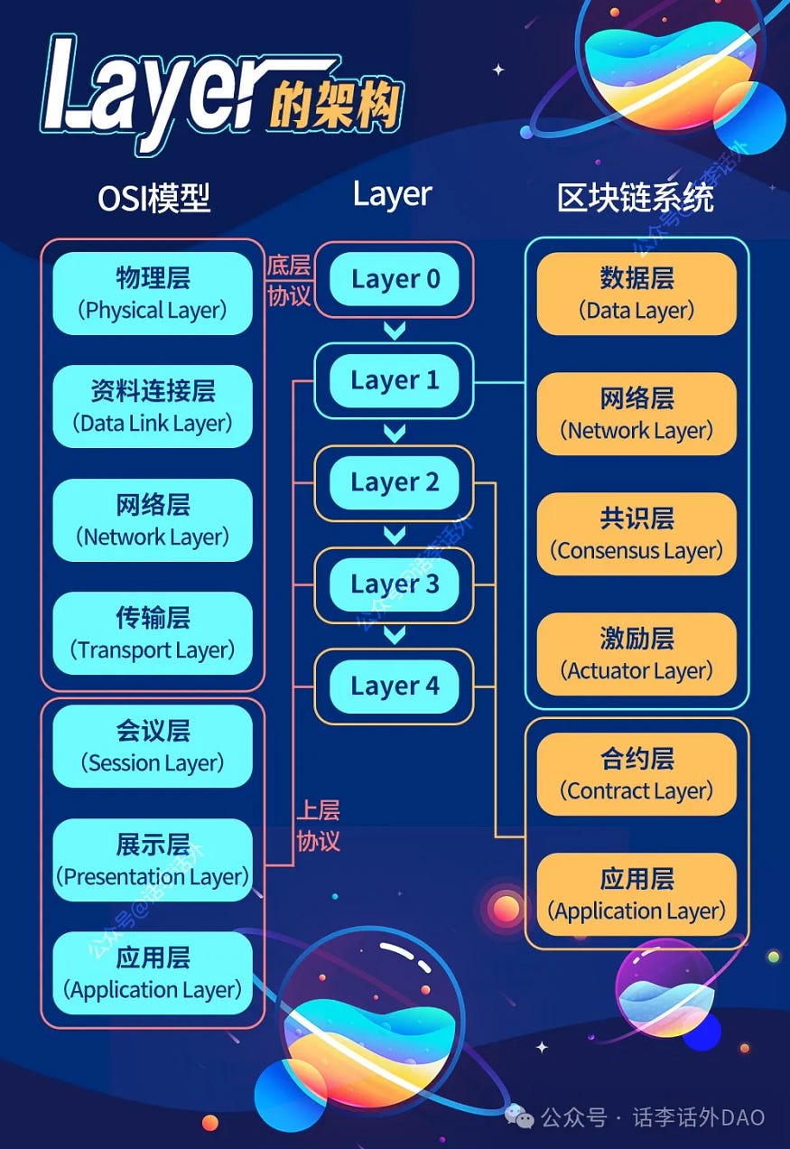 区块链系统的 6 大架构是不可或缺的,其中数据层及网络层是区块链系统中的最底层,在它们之上是由共识层、激励层、合约层及应用层共同构成区块链协议。我们可以根据区块链系统的架构再次划分,从底部开始分别为 Layer 0 到 Layer 4。