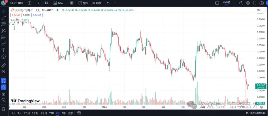 而如果我们从 ETH/BTC 比率上来看的话,似乎这种对比会更直观一些,目前该比率的数值为 0.043 附近,几乎是近一年以来的最低点。如下图所示。