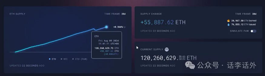 而也正是因为对 ETH 的需求降低,导致了本来进入通缩状态的 ETH,目前的通胀数又变成了正值。如下图所示。
