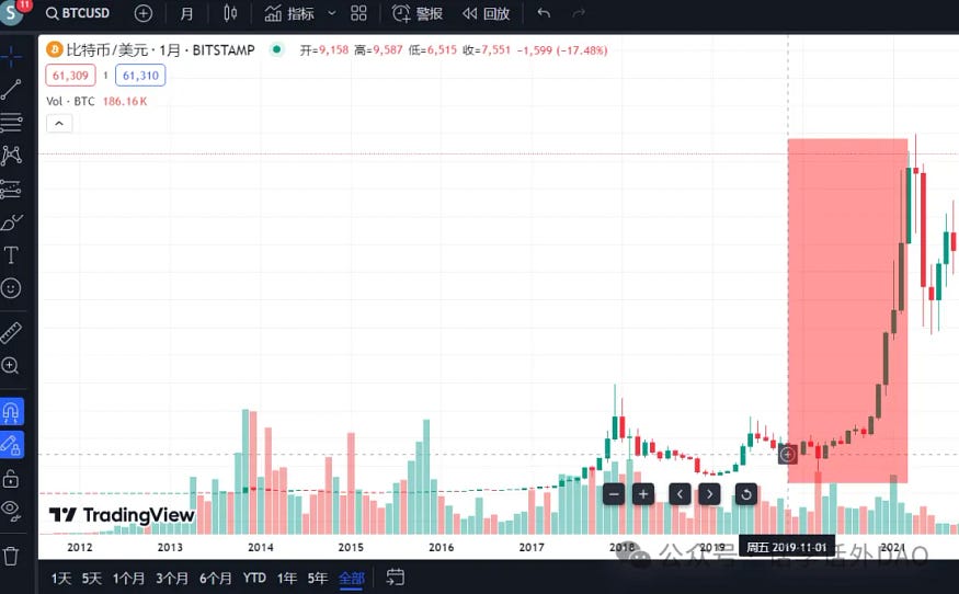 当然,上面这也仅仅是一种基于历史数据的假设,市场是不可预测的,也许剧本可能会做一些改进,让人出其不意,比如,BTC 接下来不会横盘太久就直接大幅拉涨上去呢?