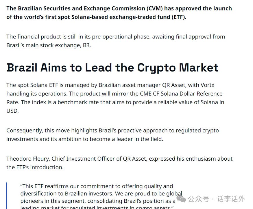 前几天(8月8日)巴西批准了全球首个基于 Solana 的现货 ETF,该产品将反映 CME CF Solana 美元参考利率,而该指数是一种基准利率,旨在提供 Solana 以美元计价的可靠价值。如下图所示。