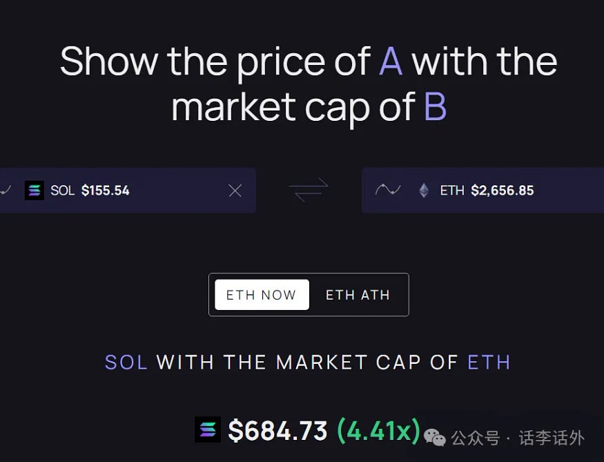 如果我们把当前 SOL 的价格与 ETH 的市值进行相对估值计算,可以发现,SOL 的相对估值是 ETH 的 4.4 倍左右。如下图所示。
