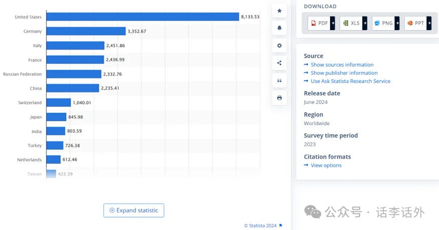 尽管现在的货币不再以黄金为支撑,但由于全球宏观局势的变化,为了防止恶性通货膨胀或其他经济冲击,一些主要的大国都囤积了大量的黄金。虽然在 1971 年的时候,尼克松终止了美元与黄金的挂钩,但目前,美国依然拥有世界上最大的黄金储备,而且数量遥遥领先,美国政府的储备量(8133.46吨)几乎相当于排在其后的三个最大的黄金持有国,即德国(3352.31吨)、意大利(2,451.84 吨)和法国(2,436.91 吨)的总和,俄罗斯位列第五(2,332.74 吨)。如下图所示。