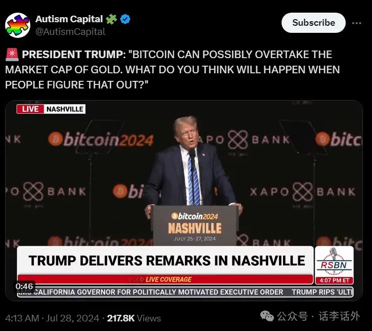 就在前几天的 bitcoin2024 比特币大会上,特朗普也公开表示说:比特币有可能超越黄金的市值。如下图所示。