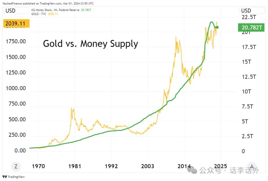 从历史来看,黄金的价格始终与美元供应量的增长保持着密切的关系,过去 50 年来,黄金价格呈指数级增长。下图显示了黄金价格与美元 M2 供应量的关系。