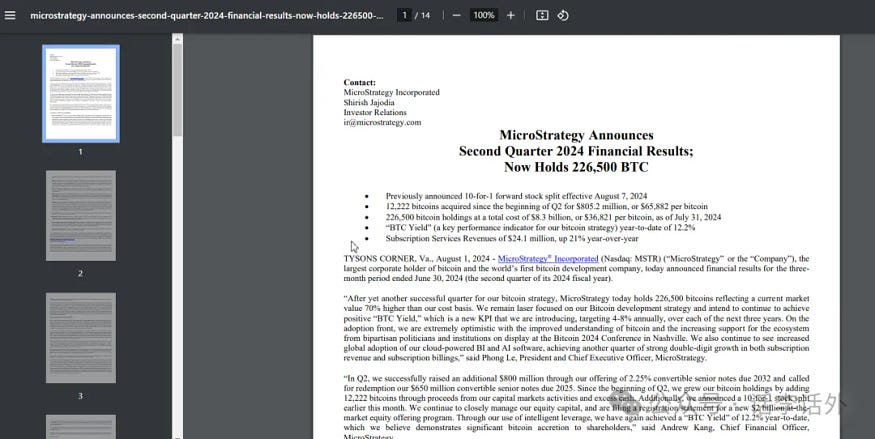相对于贝莱德这样的机构,MicroStrategy(以持有比特币为核心策略的机构之一)这样的机构则明牌的多,从他们刚刚公布的第二季度财报来看,该机构在今年第二季度又以 8.05 亿美元的价格购买了 12,222 枚比特币,使其比特币总持有量达到 226,500 枚 BTC(平均价格为每枚比特币 36,821 美元)。如下图所示。