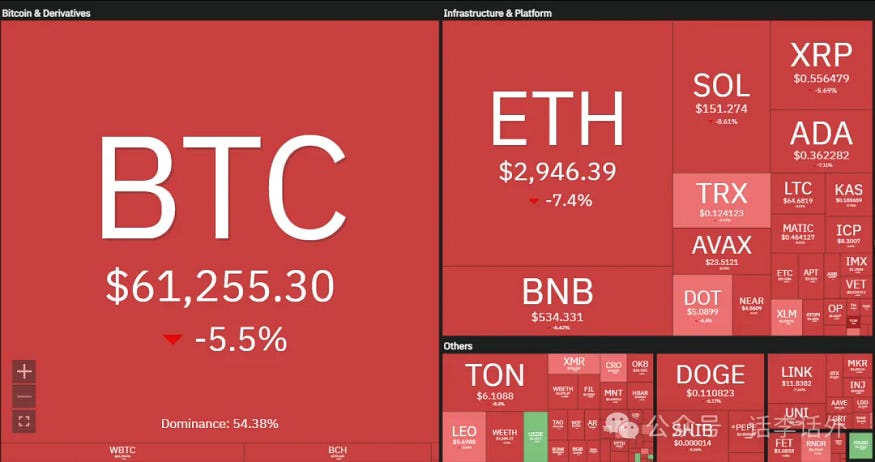 受此影响,比特币也出现了一些跌幅,截止撰写本文时的最新位置为 61,000 美元附近。而随着比特币的下跌,各种山寨币的跌幅则更大。如下图所示。
