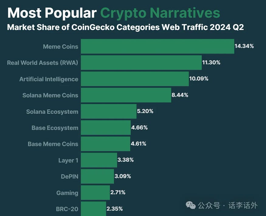 根据 CoinGecko 最新发布的 2024 年 Q2 行业报告数据显示,MemeCoin、AI 和 RWA 等 15 个叙事占据了 77.5% 的加密市场份额。其中,MemeCoin 直接霸占了榜单的主导地位,前 15 个最受欢迎的加密叙述中有 4 个与 MemeCoin 有关。如下图所示。
